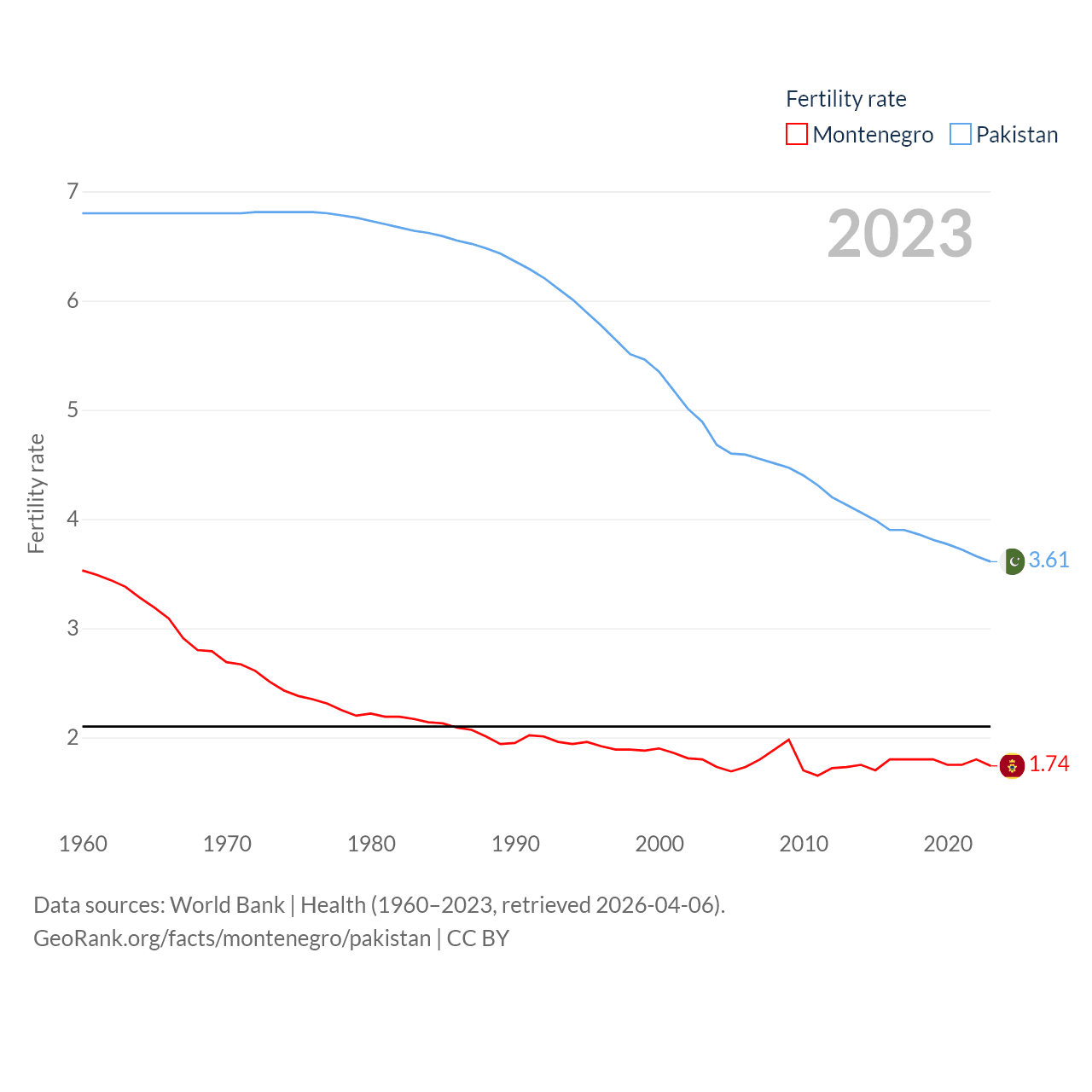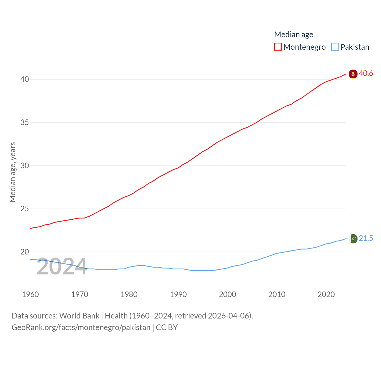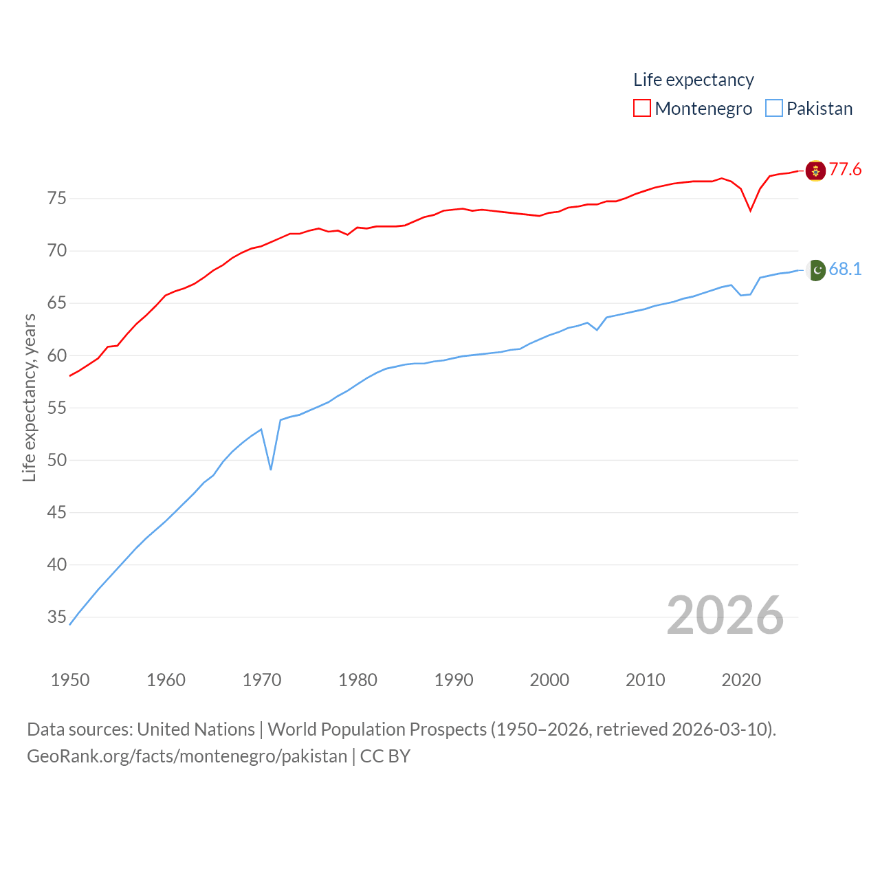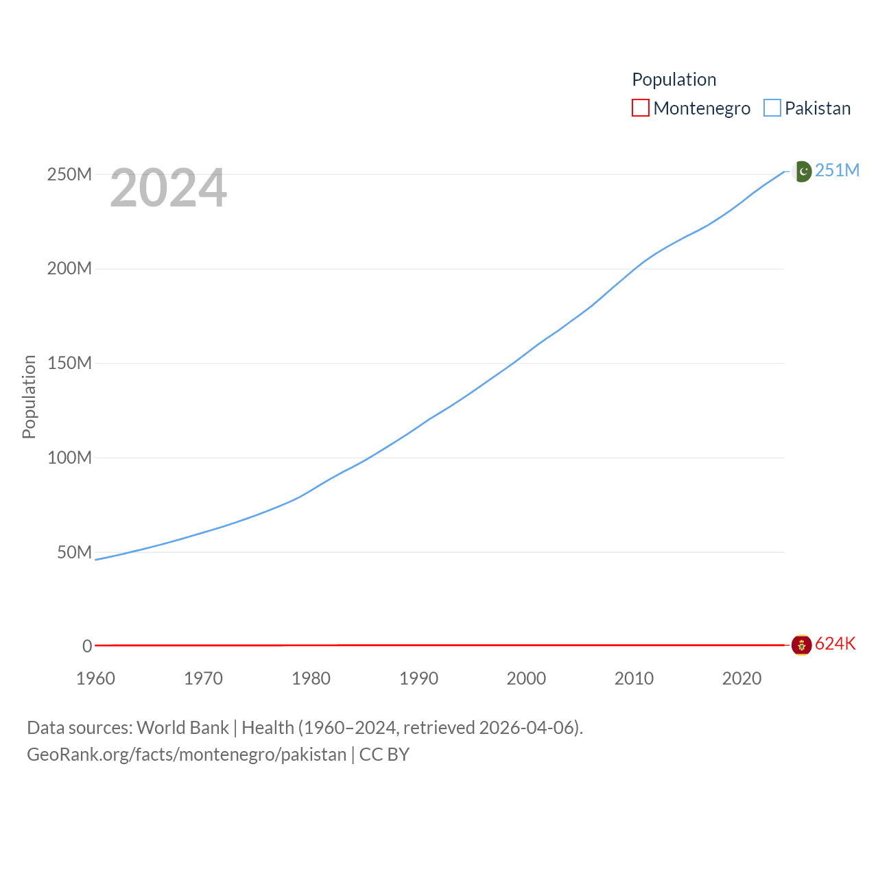 Montenegro has a population of 624K (ranked 166/197), compared with 251M in Pakistan (ranked 5/197). Montenegro's land area is 5,193 sq mi versus 297,638 sq mi for Pakistan (ranked 156th vs. 35th).