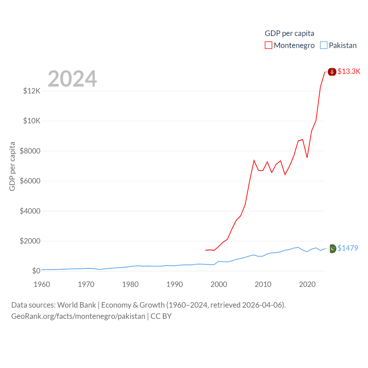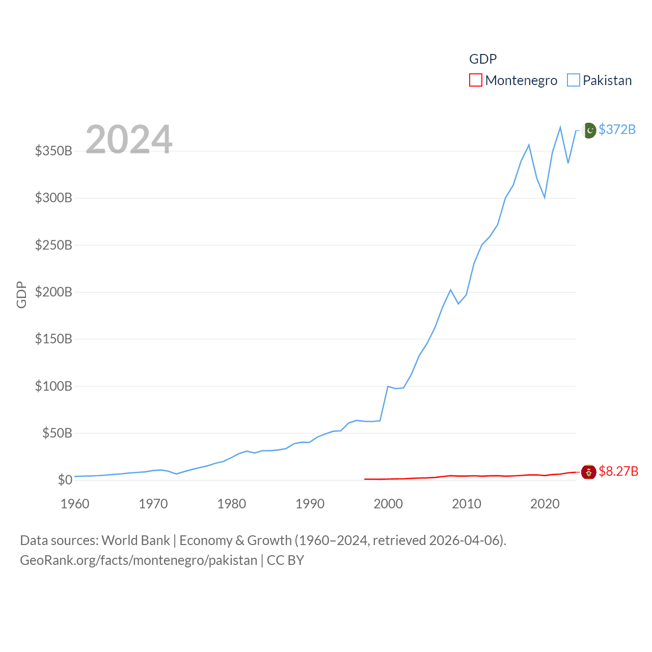 By GDP, Montenegro ranks 155/197 ($8.27B) and Pakistan ranks 43/197 ($372B). By GDP per capita, Montenegro ranks 77/197 ($13,263), while Pakistan ranks 163/197 ($1,479).
