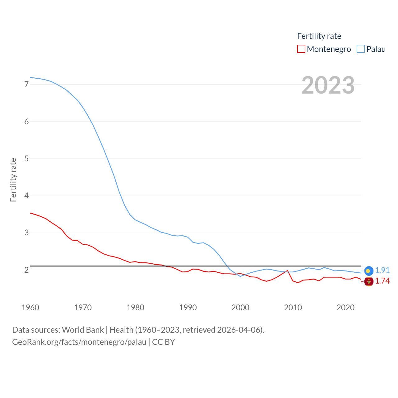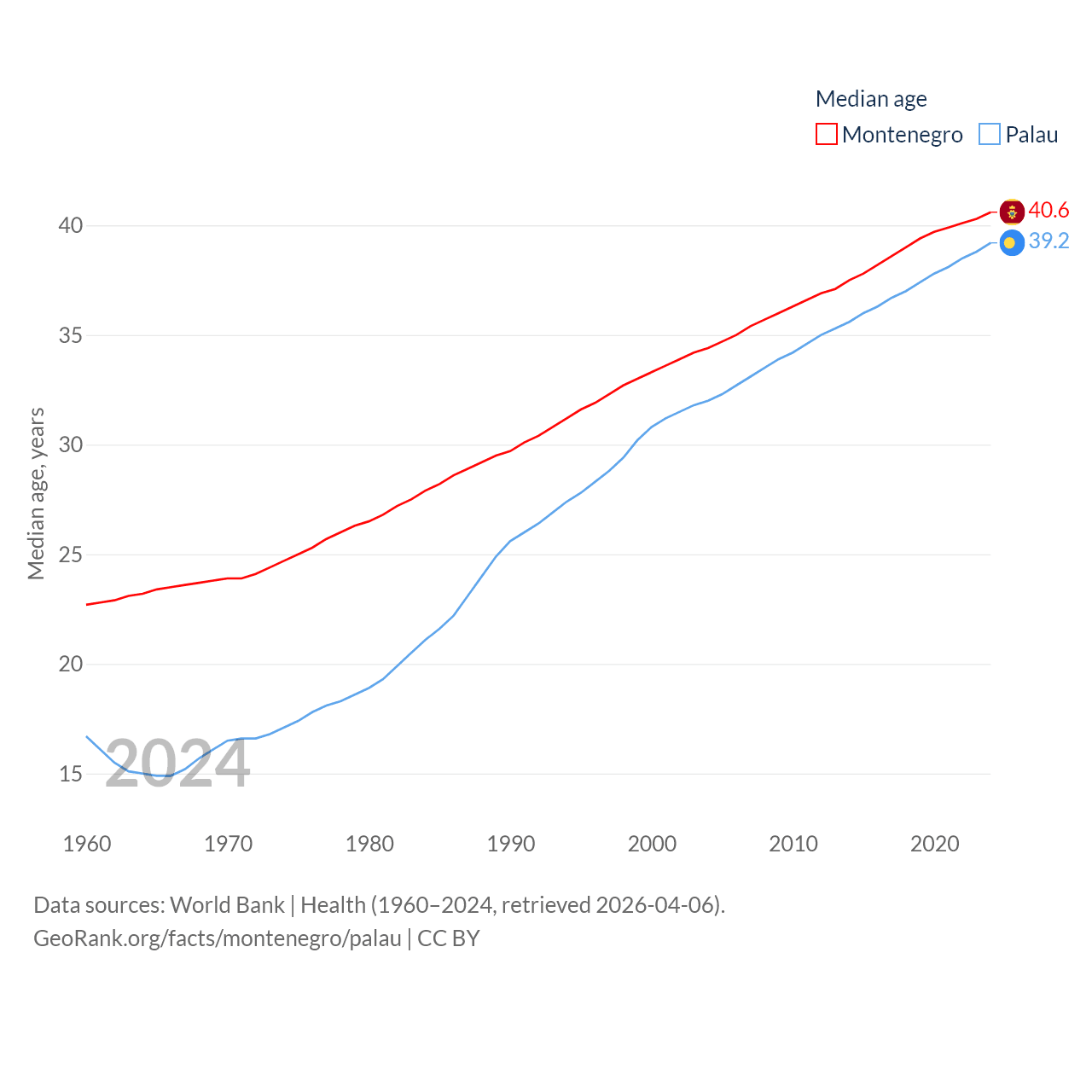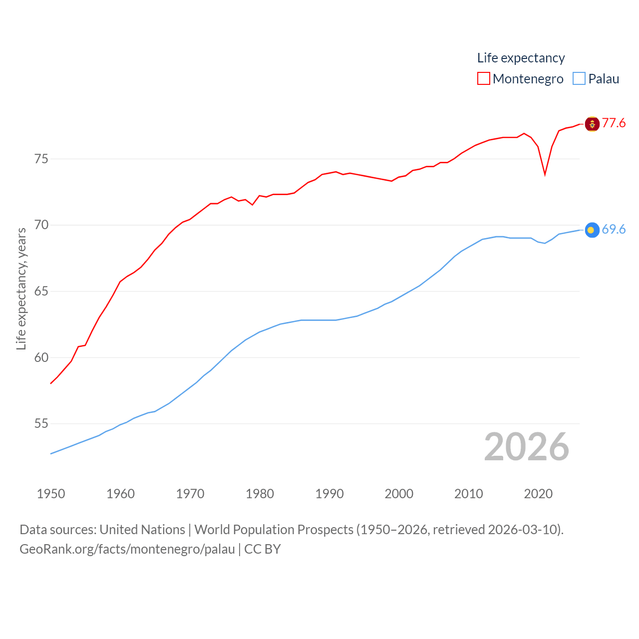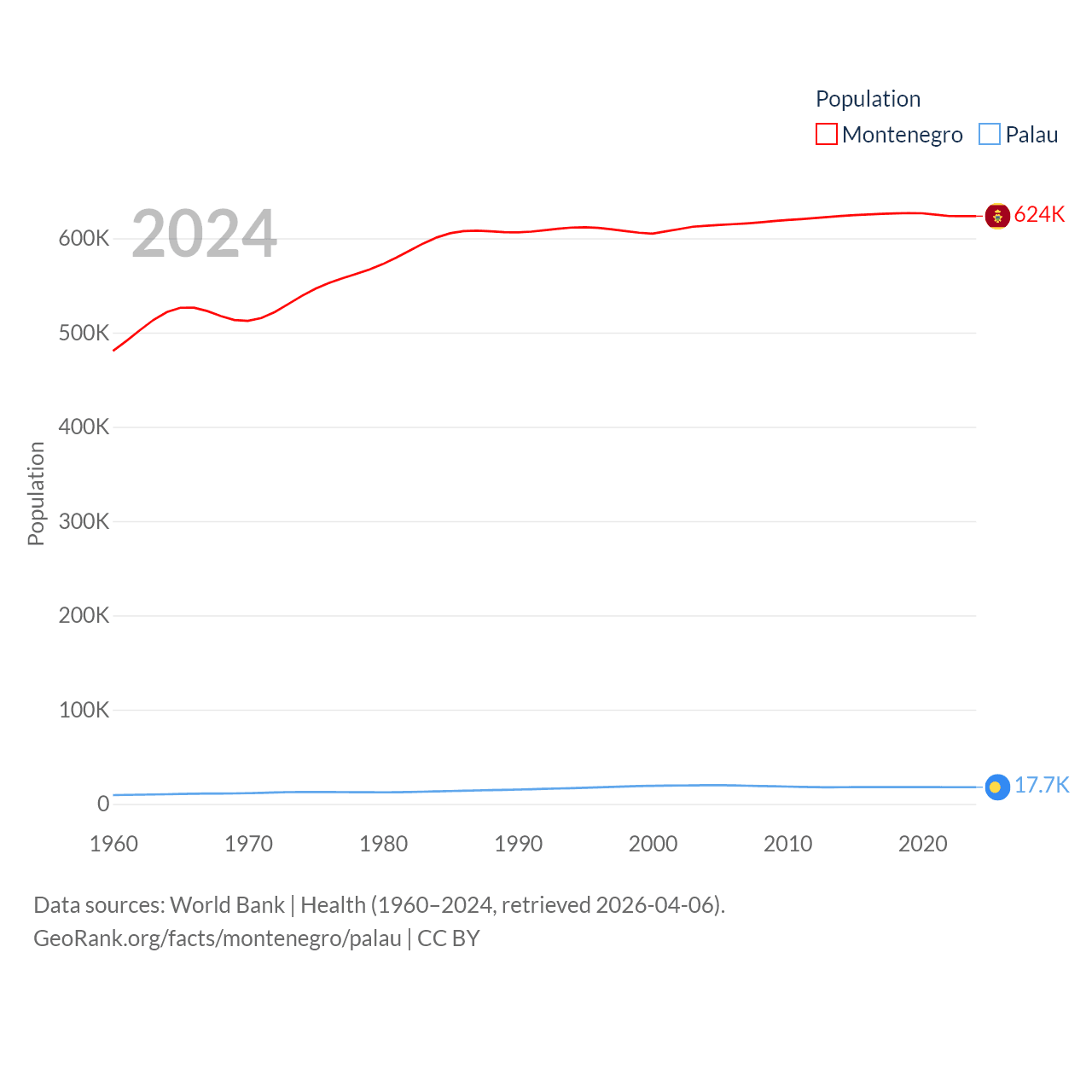 Montenegro has a population of 624K (ranked 166/197), compared with 17.7K in Palau (ranked 194/197). Montenegro's land area is 5,193 sq mi versus 177.6 sq mi for Palau (ranked 156th vs. 180th).