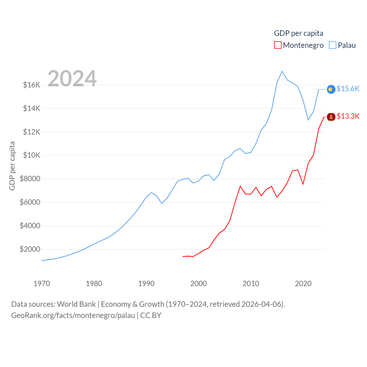 By GDP, Montenegro ranks 155/197 ($8.27B) and Palau ranks 194/197 ($277M). By GDP per capita, Montenegro ranks 77/197 ($13,263), while Palau ranks 67/197 ($15,611).