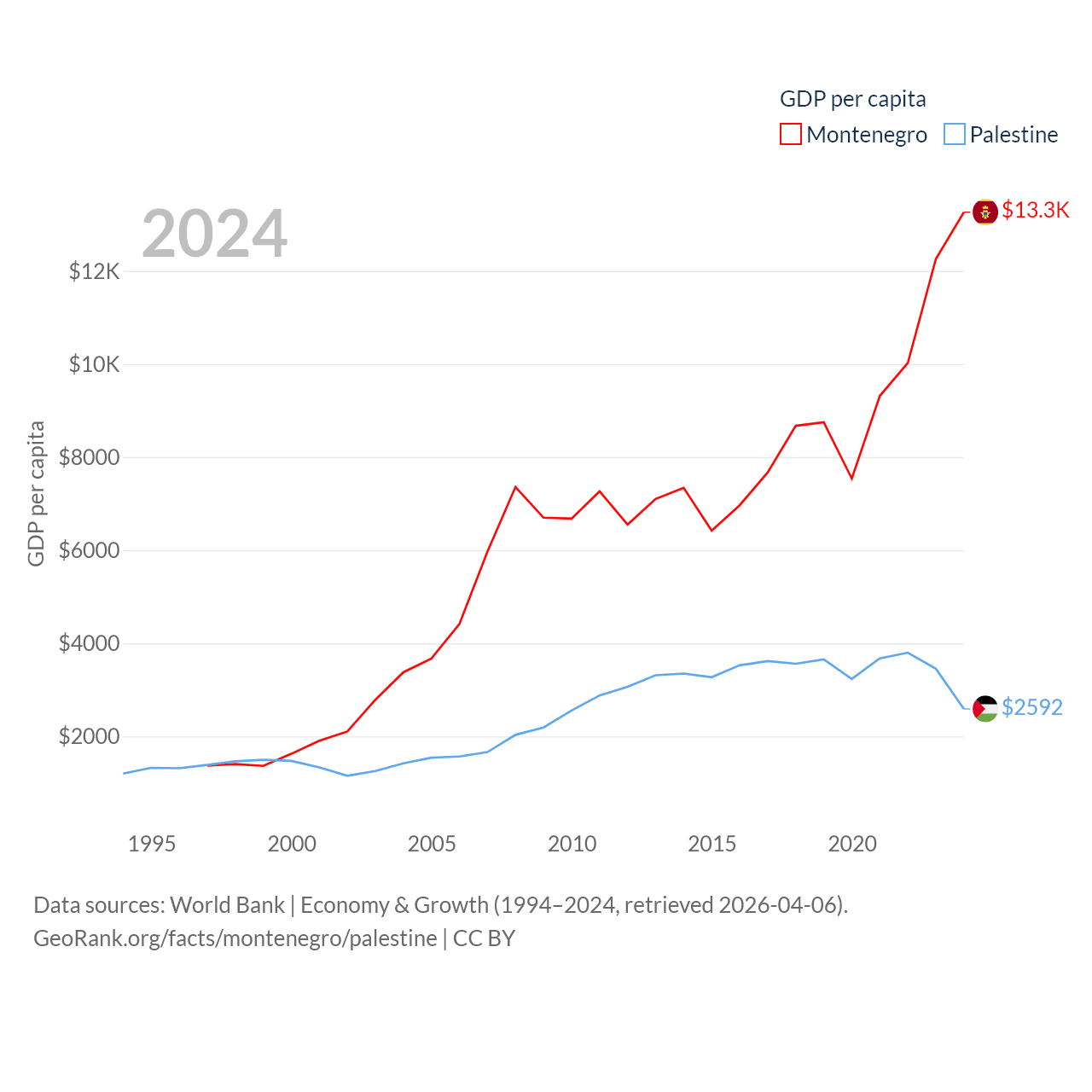 By GDP, Montenegro ranks 155/197 ($8.27B) and Palestine ranks 146/197 ($13.7B). By GDP per capita, Montenegro ranks 77/197 ($13,263), while Palestine ranks 147/197 ($2,592).
