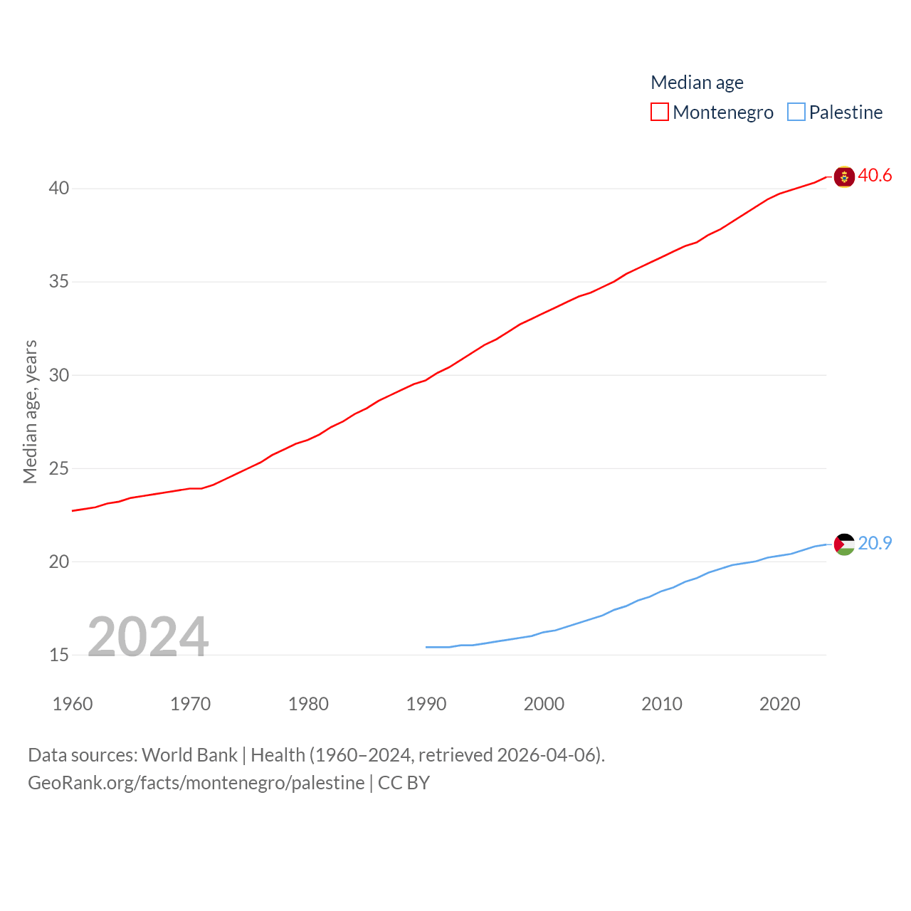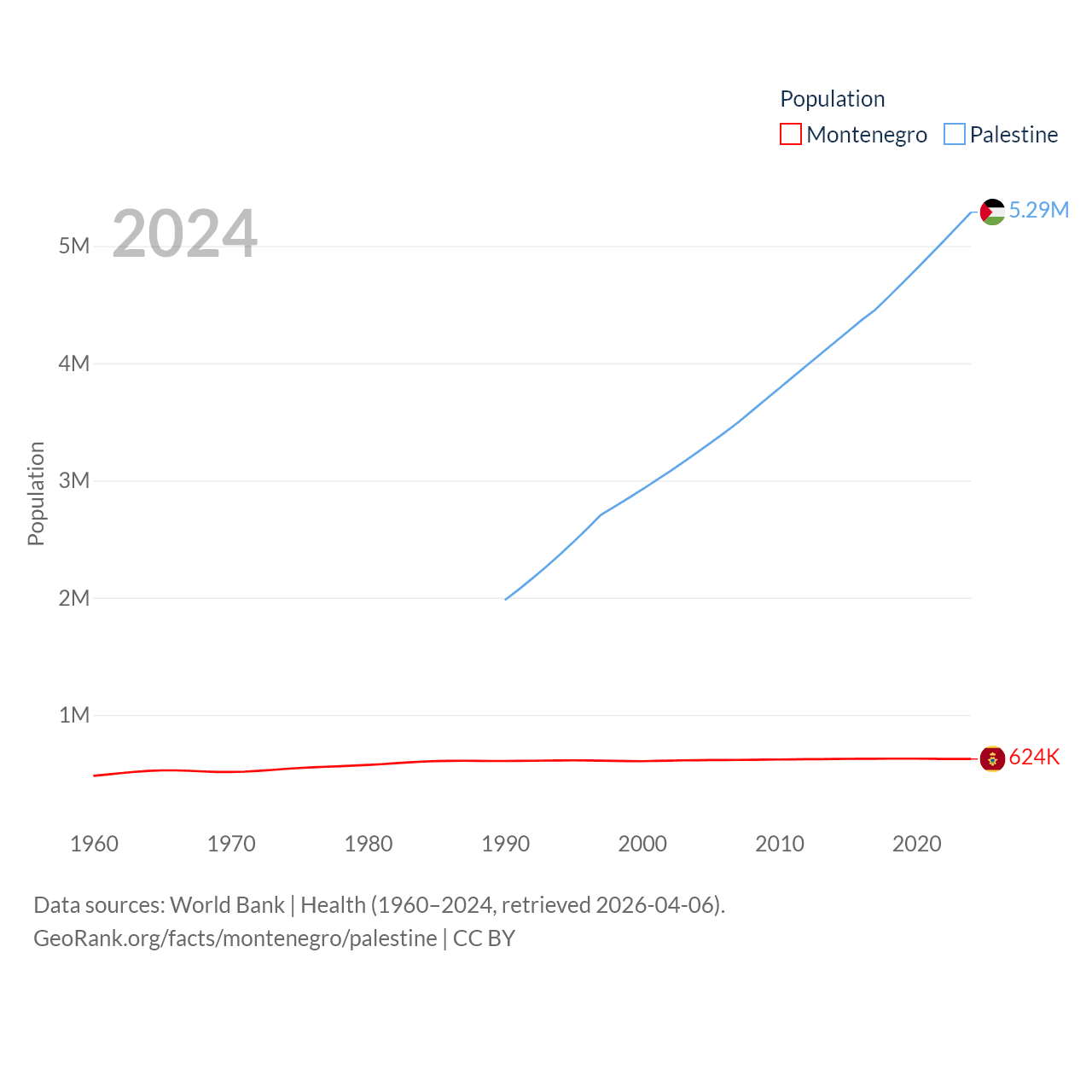 Montenegro has a population of 624K (ranked 166/197), compared with 5.29M in Palestine (ranked 122/197). Montenegro's land area is 5,193 sq mi versus 2,326 sq mi for Palestine (ranked 156th vs. 164th).