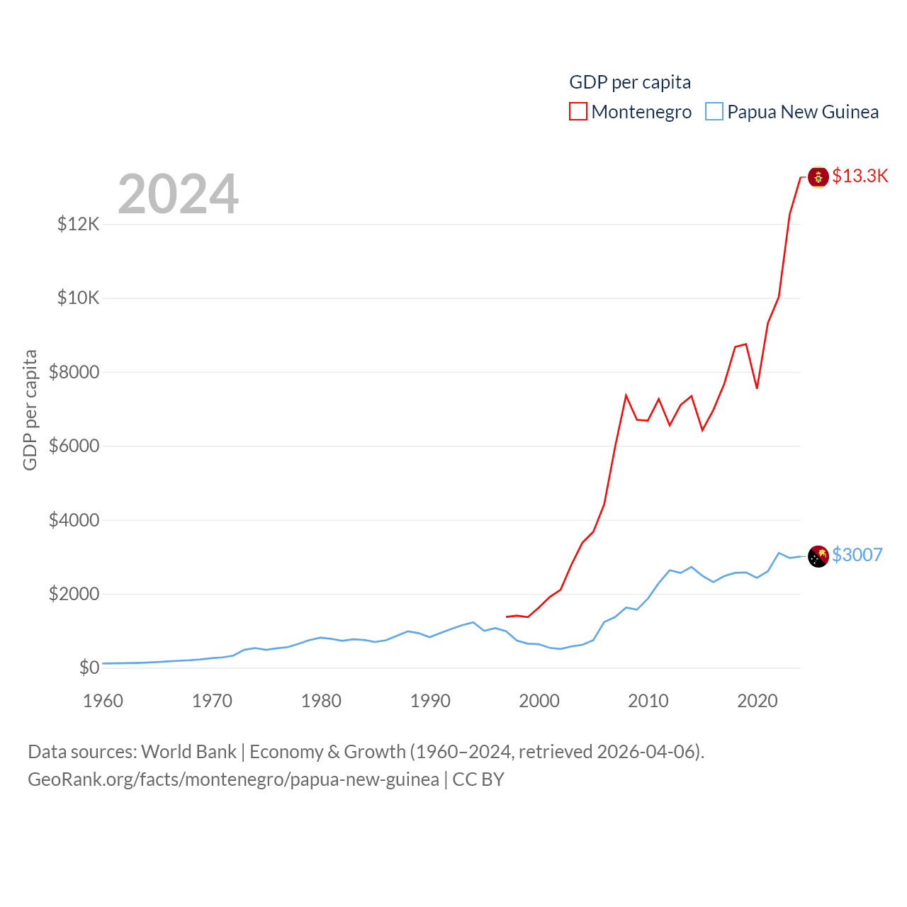 By GDP, Montenegro ranks 155/197 ($8.27B) and Papua New Guinea ranks 110/197 ($31.8B). By GDP per capita, Montenegro ranks 77/197 ($13,263), while Papua New Guinea ranks 140/197 ($3,007).