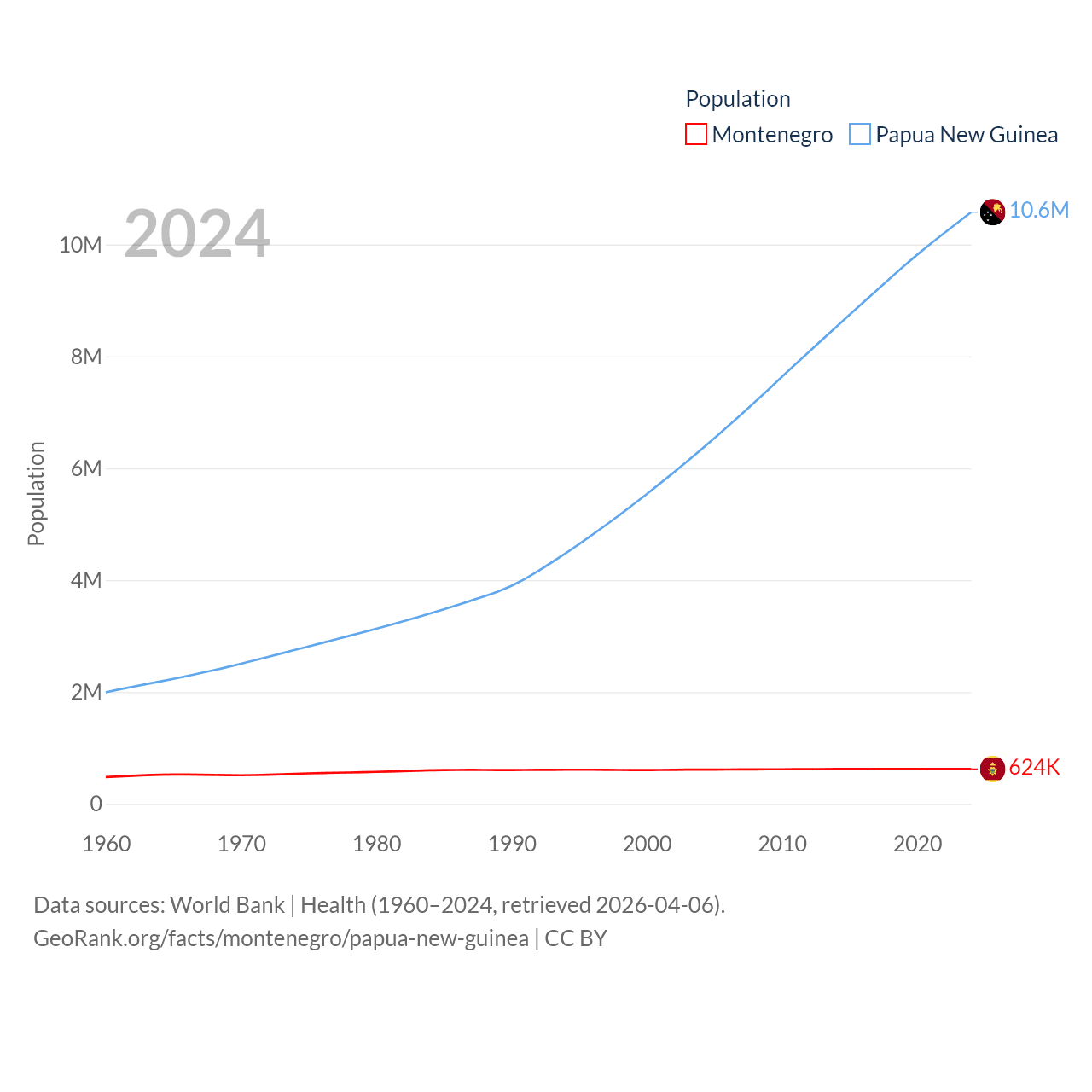 Montenegro has a population of 624K (ranked 166/197), compared with 10.6M in Papua New Guinea (ranked 92/197). Montenegro's land area is 5,193 sq mi versus 174,850 sq mi for Papua New Guinea (ranked 156th vs. 54th).