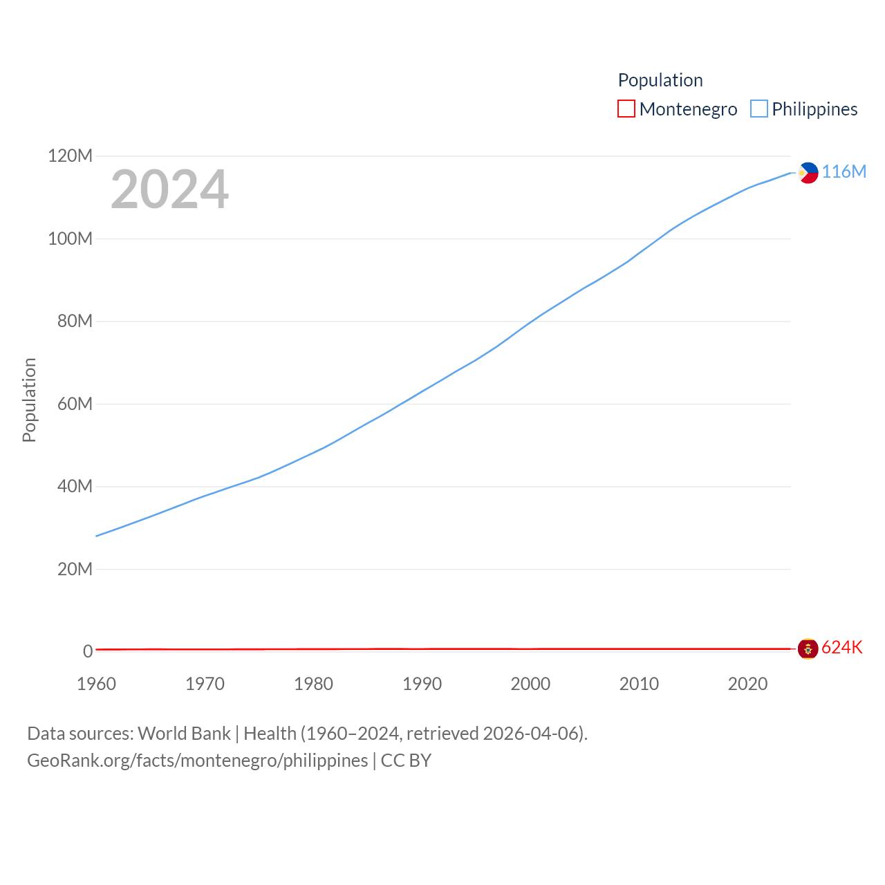 Montenegro has a population of 624K (ranked 166/197), compared with 116M in The Philippines (ranked 14/197). Montenegro's land area is 5,193 sq mi versus 115,124 sq mi for The Philippines (ranked 156th vs. 71st).
