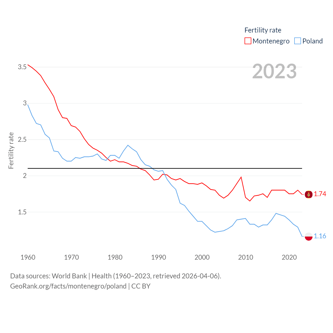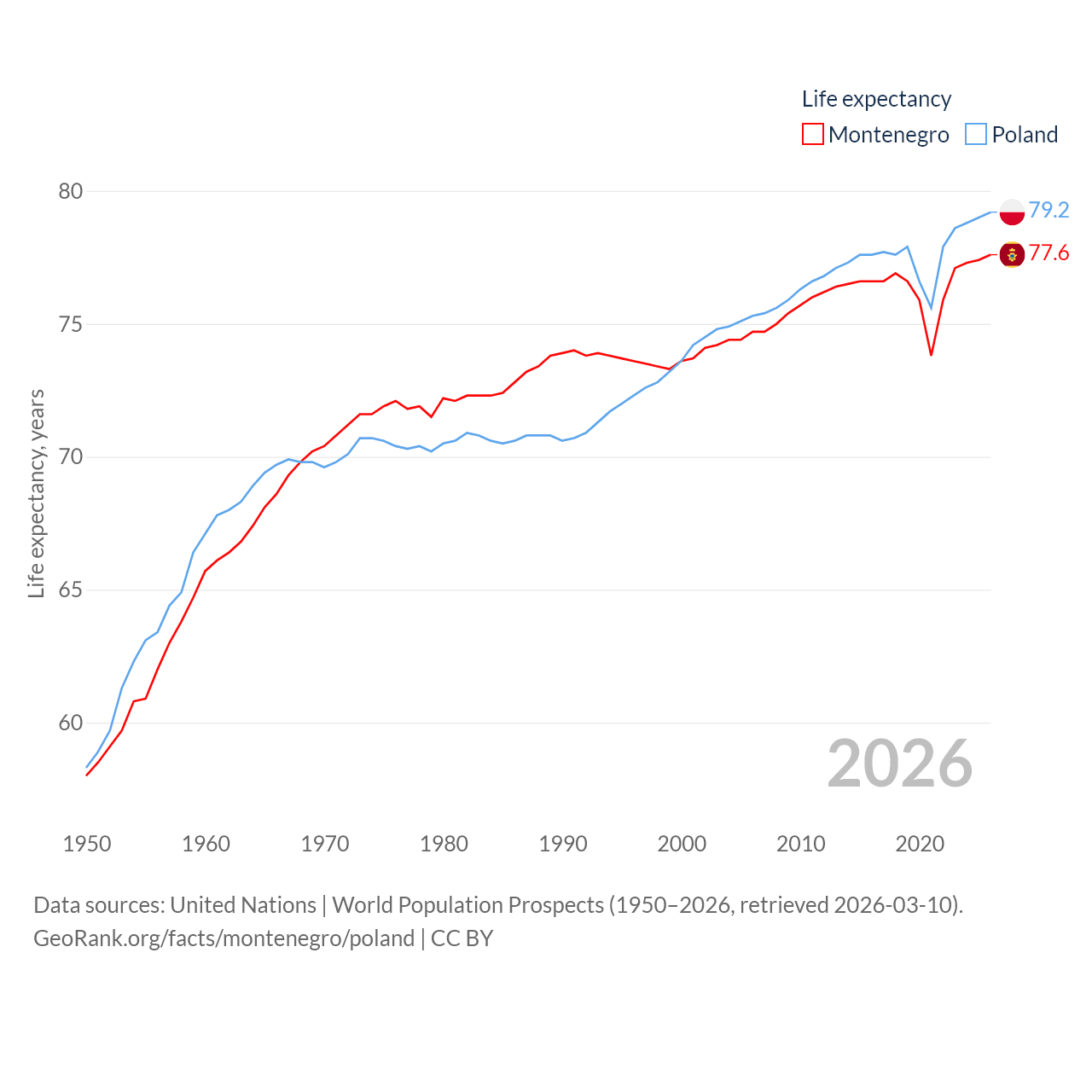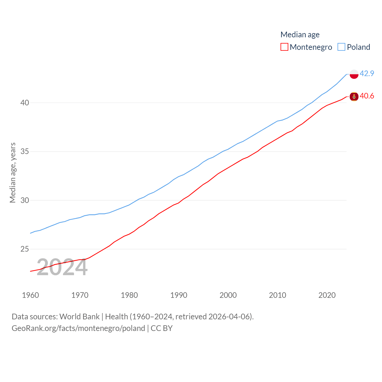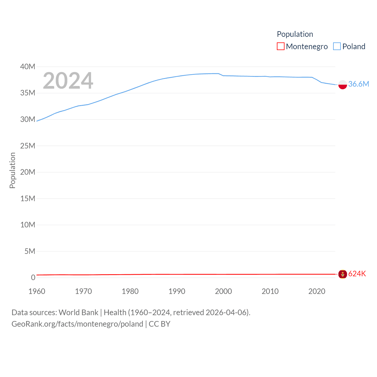 Montenegro has a population of 624K (ranked 166/197), compared with 36.6M in Poland (ranked 42/197). Montenegro's land area is 5,193 sq mi versus 118,252 sq mi for Poland (ranked 156th vs. 69th).