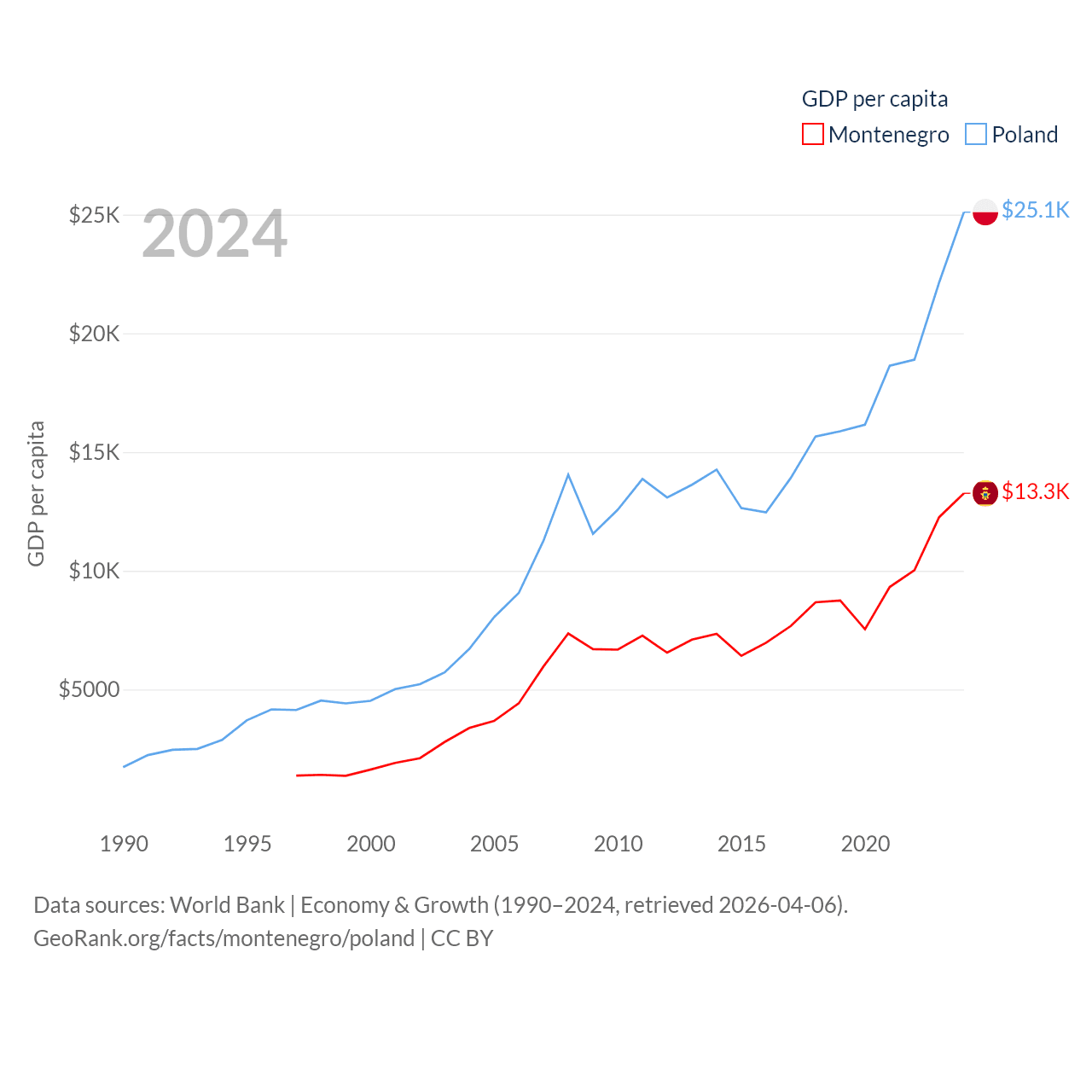 By GDP, Montenegro ranks 155/197 ($8.27B) and Poland ranks 21/197 ($918B). By GDP per capita, Montenegro ranks 77/197 ($13,263), while Poland ranks 48/197 ($25,104).