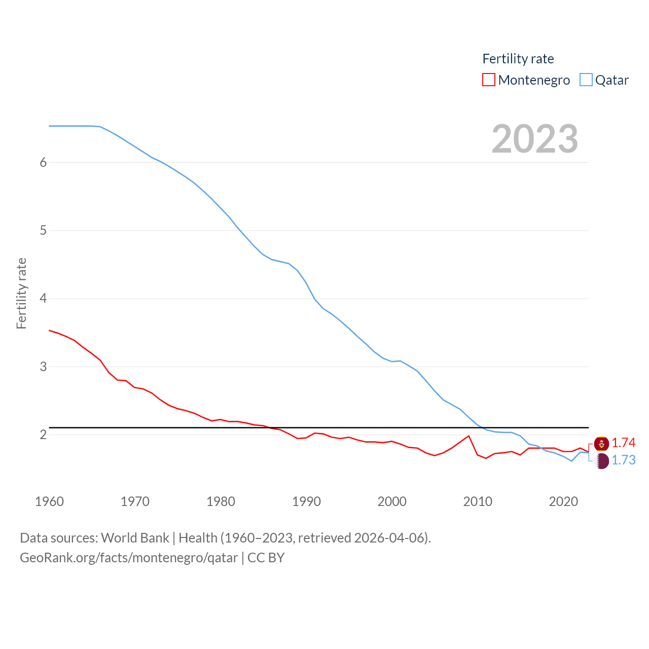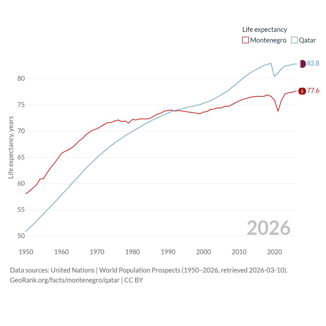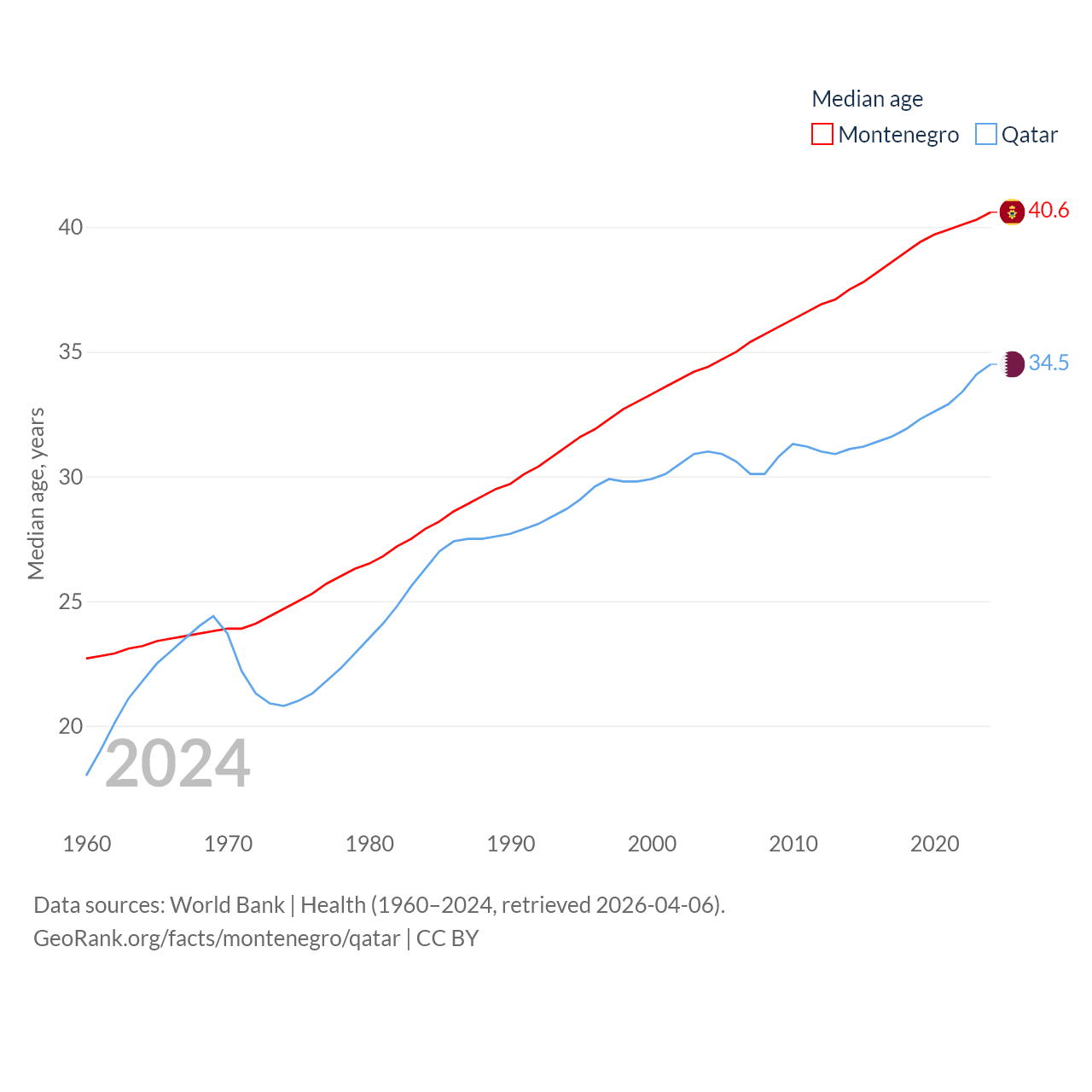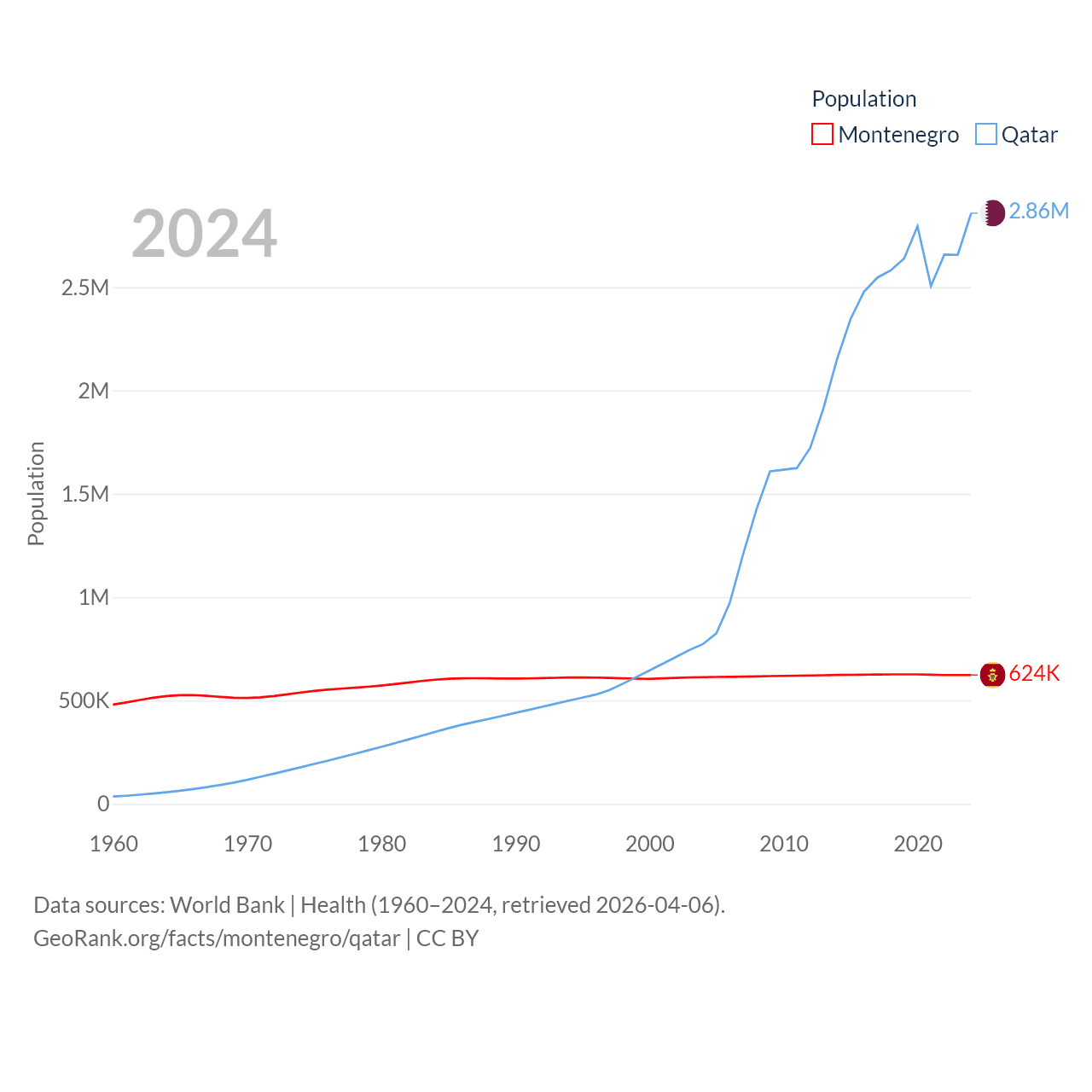 Montenegro has a population of 624K (ranked 166/197), compared with 2.86M in Qatar (ranked 138/197). Montenegro's land area is 5,193 sq mi versus 4,436 sq mi for Qatar (ranked 156th vs. 158th).