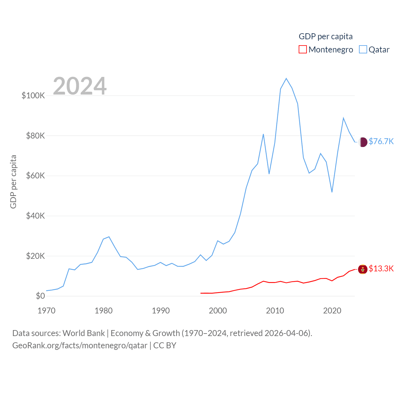 By GDP, Montenegro ranks 155/197 ($8.27B) and Qatar ranks 56/197 ($219B). By GDP per capita, Montenegro ranks 77/197 ($13,263), while Qatar ranks 11/197 ($76,689).