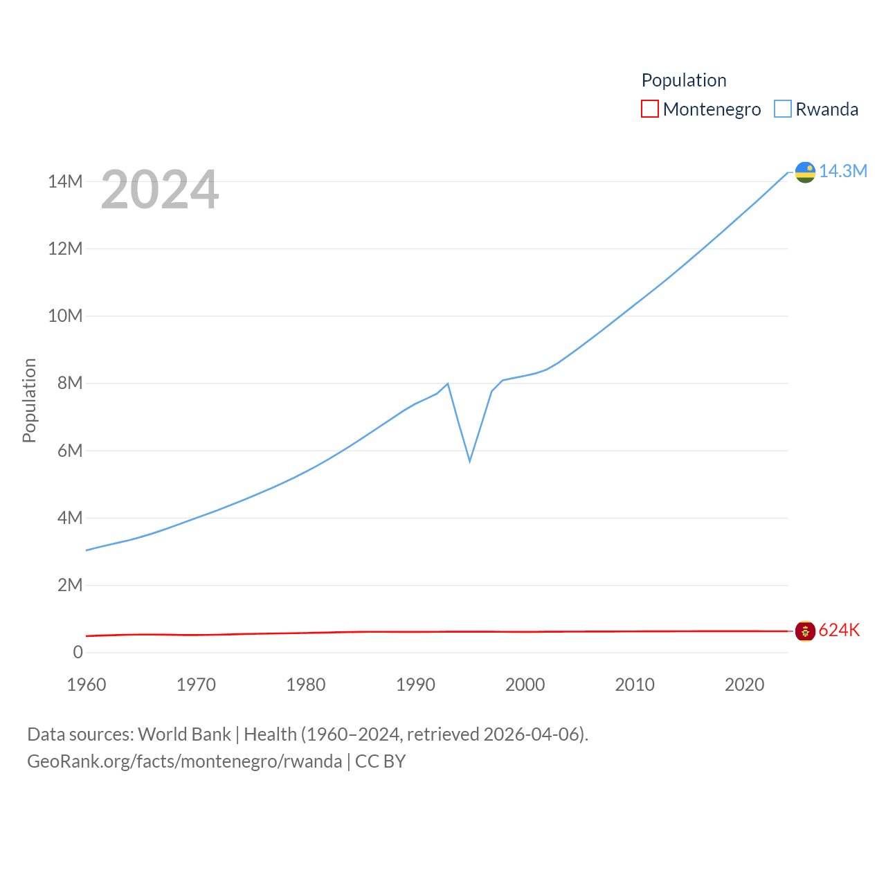 Montenegro has a population of 624K (ranked 166/197), compared with 14.3M in Rwanda (ranked 77/197). Montenegro's land area is 5,193 sq mi versus 9,525 sq mi for Rwanda (ranked 156th vs. 146th).
