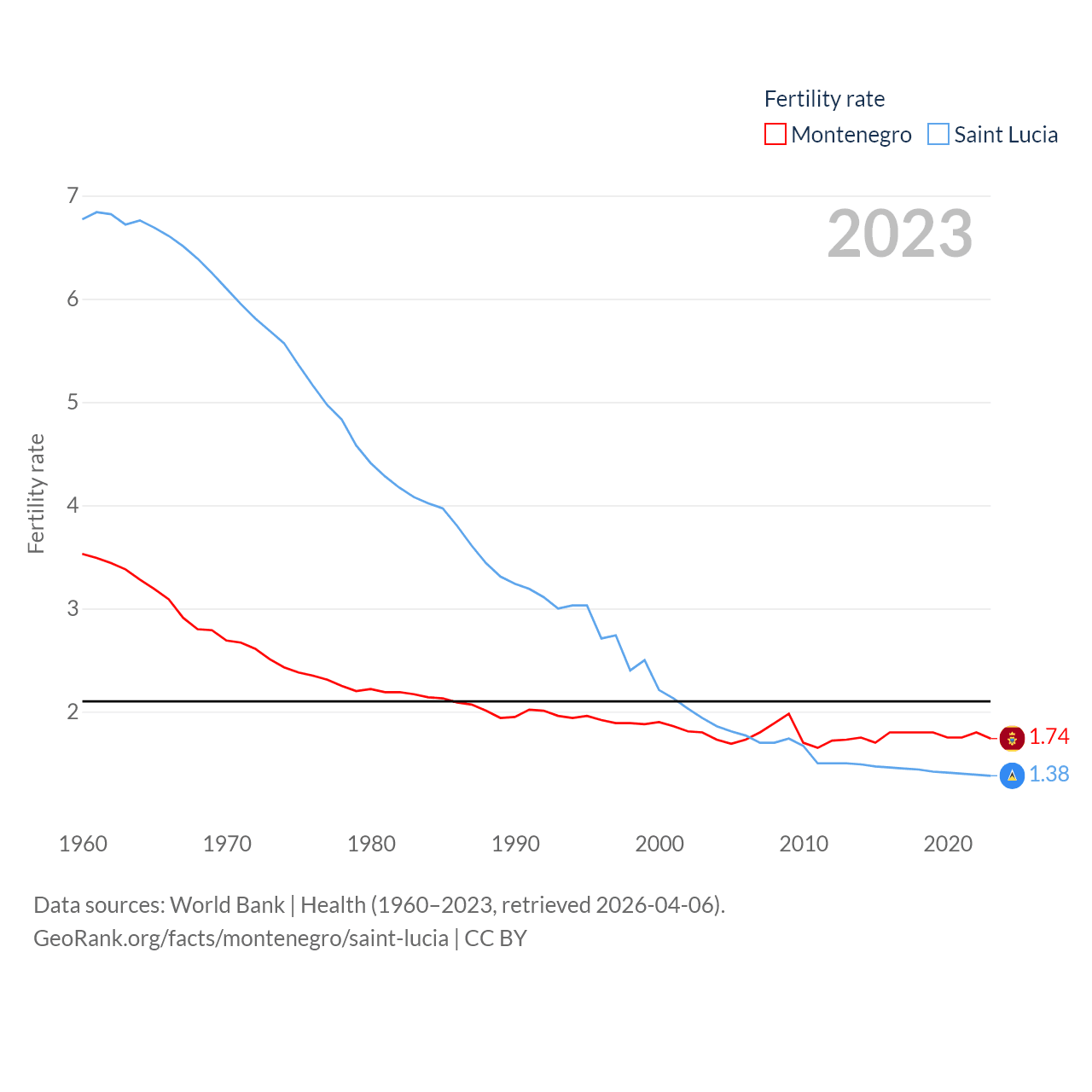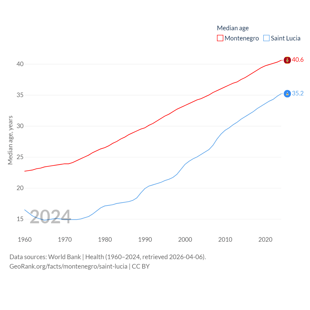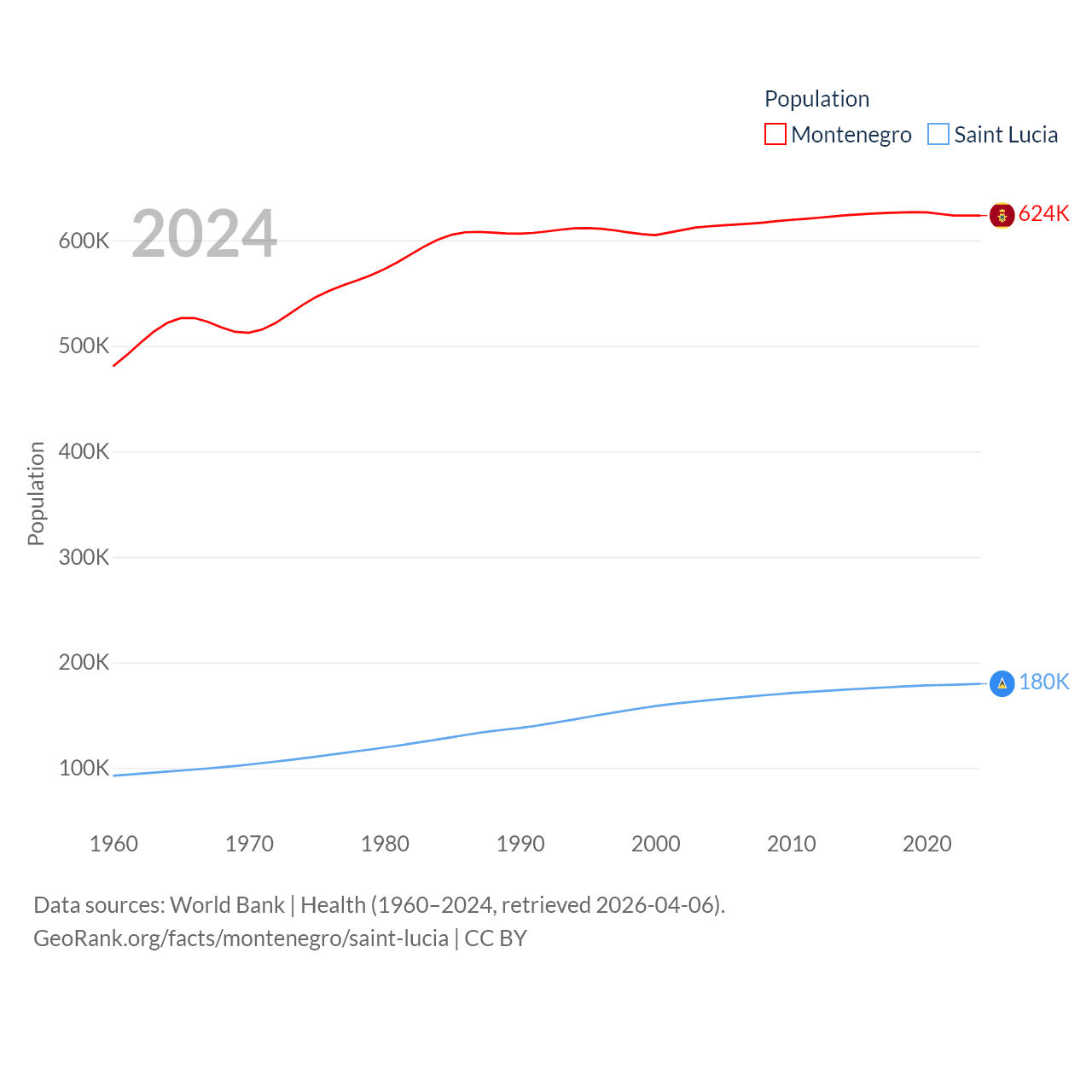 Montenegro has a population of 624K (ranked 166/197), compared with 180K in Saint Lucia (ranked 178/197). Montenegro's land area is 5,193 sq mi versus 235.5 sq mi for Saint Lucia (ranked 156th vs. 178th).