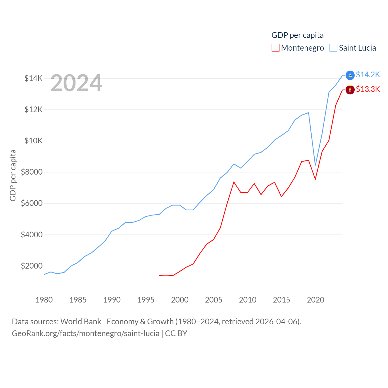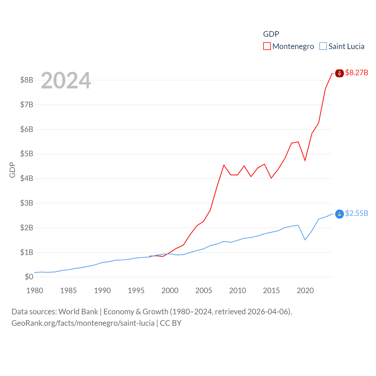 By GDP, Montenegro ranks 155/197 ($8.27B) and Saint Lucia ranks 173/197 ($2.55B). By GDP per capita, Montenegro ranks 77/197 ($13,263), while Saint Lucia ranks 70/197 ($14,182).
