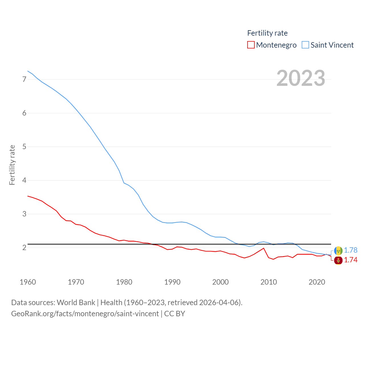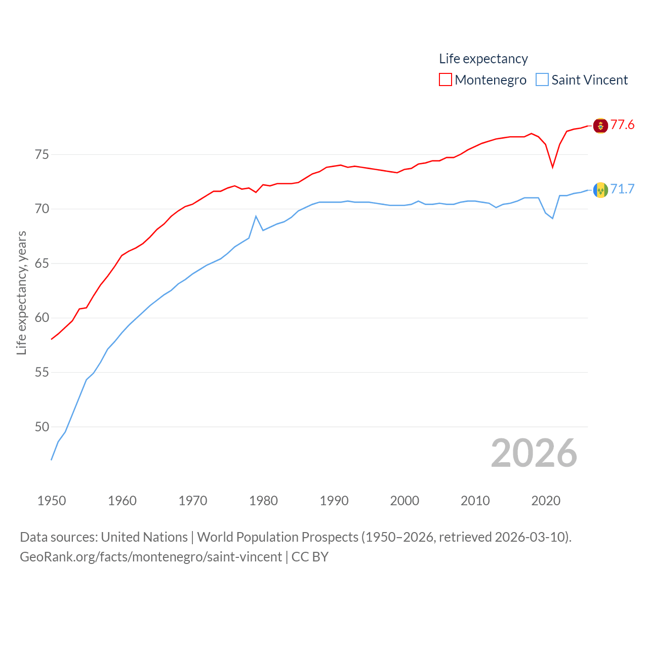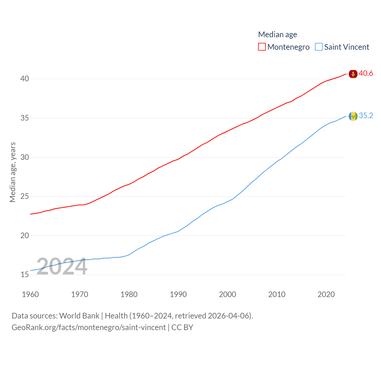 Montenegro has a population of 624K (ranked 166/197), compared with 101K in Saint Vincent (ranked 184/197). Montenegro's land area is 5,193 sq mi versus 150.6 sq mi for Saint Vincent (ranked 156th vs. 185th).