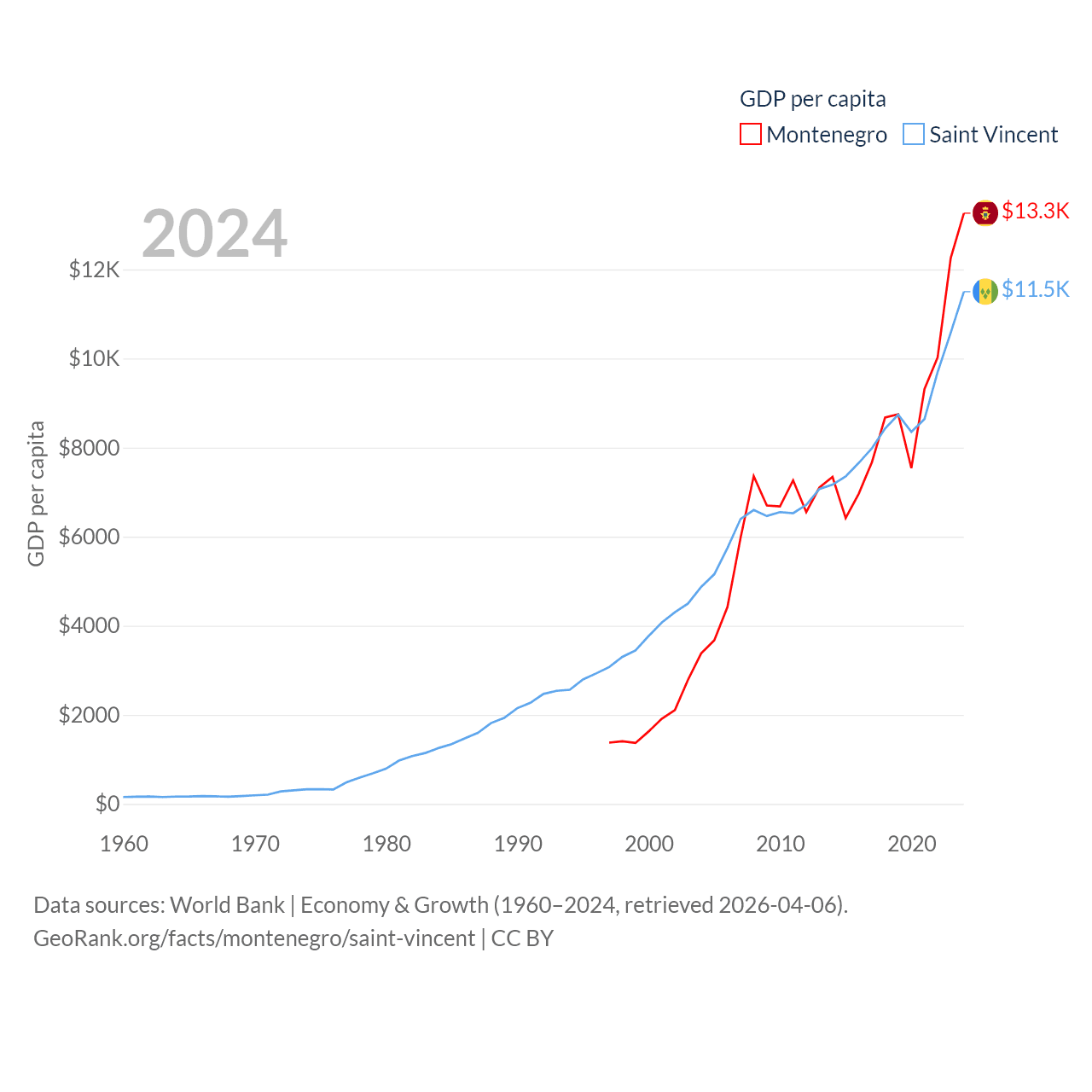 By GDP, Montenegro ranks 155/197 ($8.27B) and Saint Vincent ranks 186/197 ($1.16B). By GDP per capita, Montenegro ranks 77/197 ($13,263), while Saint Vincent ranks 81/197 ($11,501).