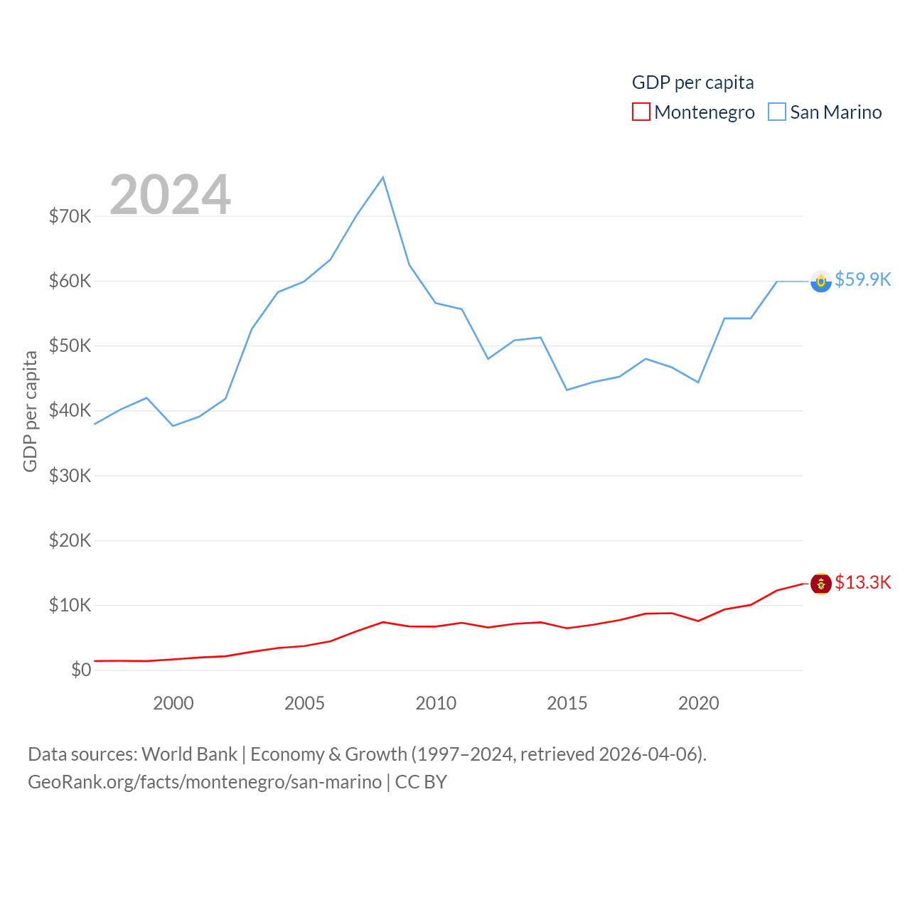 By GDP, Montenegro ranks 155/197 ($8.27B) and San Marino ranks 180/197 ($2.03B). By GDP per capita, Montenegro ranks 77/197 ($13,263), while San Marino ranks 15/197 ($59,880).
