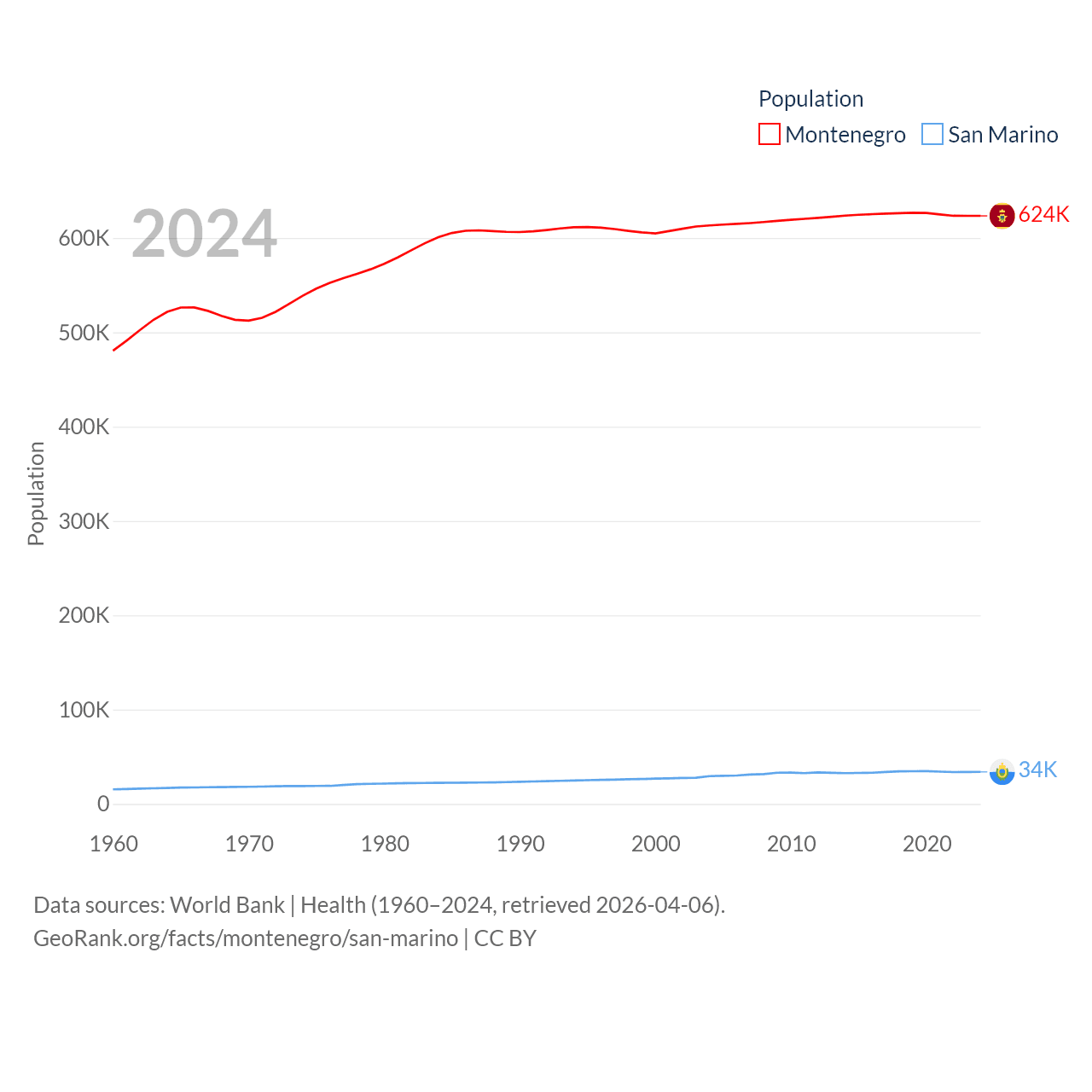 Montenegro has a population of 624K (ranked 166/197), compared with 34K in San Marino (ranked 193/197). Montenegro's land area is 5,193 sq mi versus 23.2 sq mi for San Marino (ranked 156th vs. 193rd).