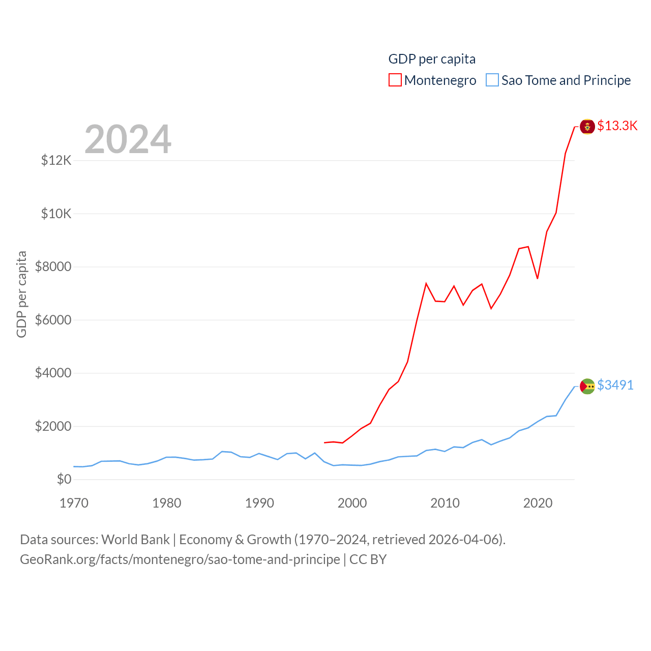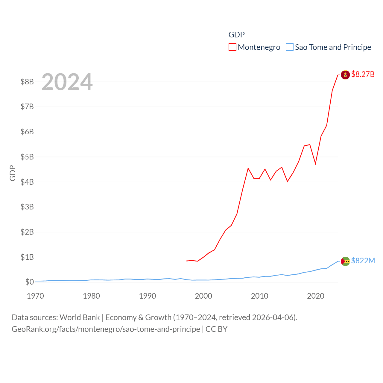 By GDP, Montenegro ranks 155/197 ($8.27B) and Sao Tome and Principe ranks 189/197 ($822M). By GDP per capita, Montenegro ranks 77/197 ($13,263), while Sao Tome and Principe ranks 134/197 ($3,491).