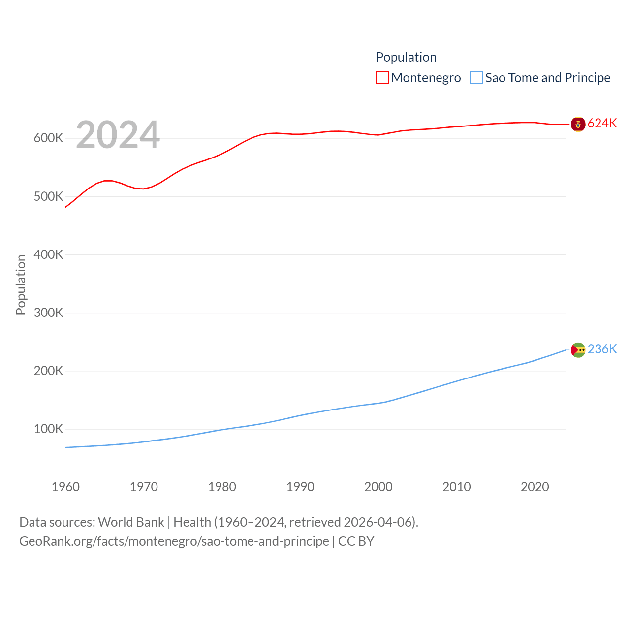 Montenegro has a population of 624K (ranked 166/197), compared with 236K in Sao Tome and Principe (ranked 176/197). Montenegro's land area is 5,193 sq mi versus 371 sq mi for Sao Tome and Principe (ranked 156th vs. 172nd).