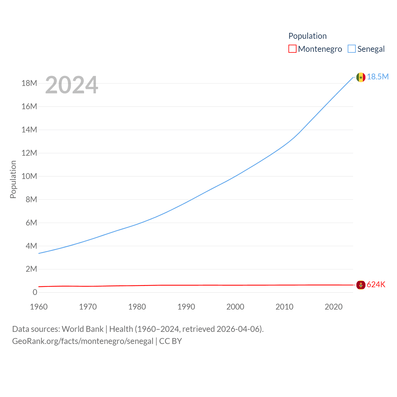 Montenegro has a population of 624K (ranked 166/197), compared with 18.5M in Senegal (ranked 69/197). Montenegro's land area is 5,193 sq mi versus 74,336 sq mi for Senegal (ranked 156th vs. 85th).