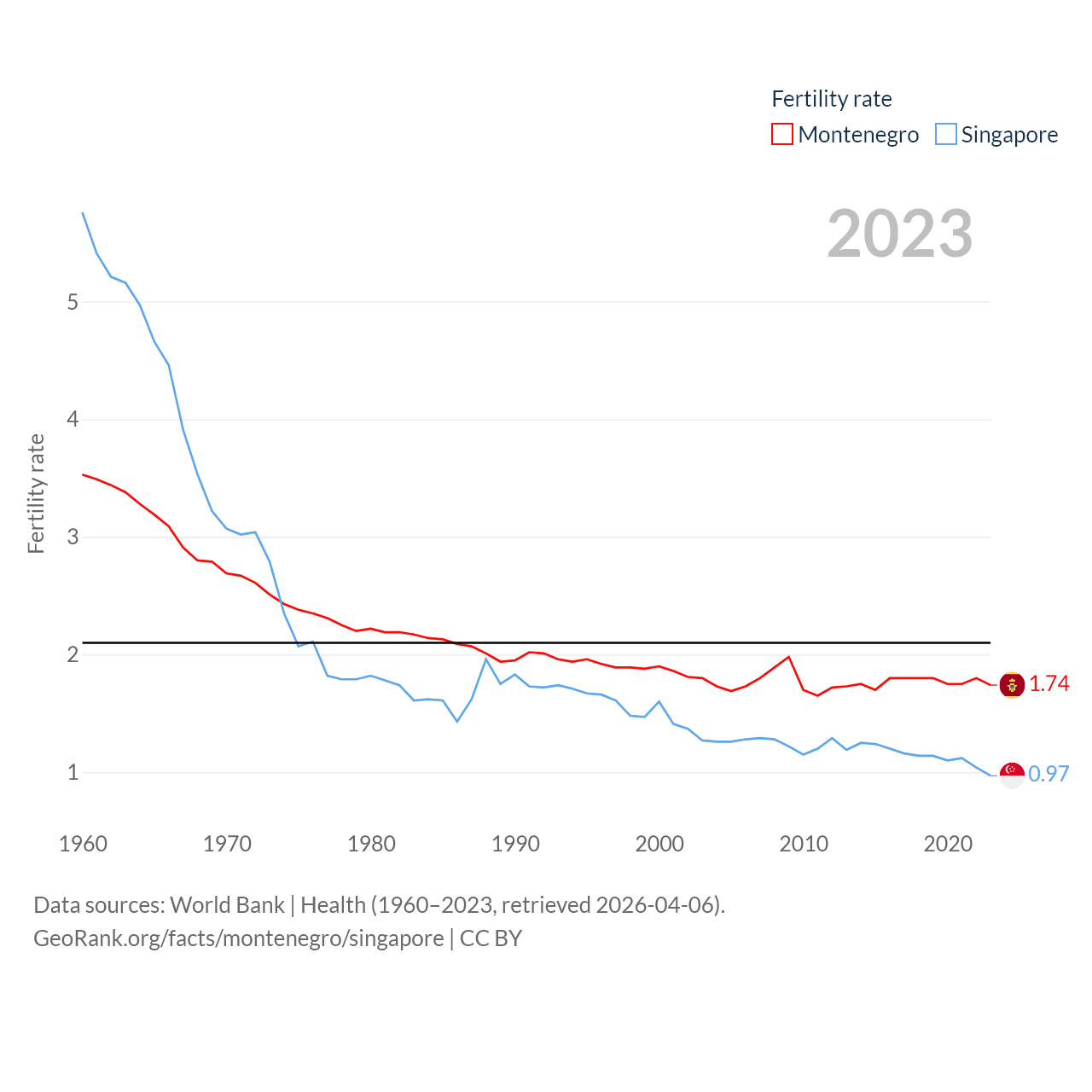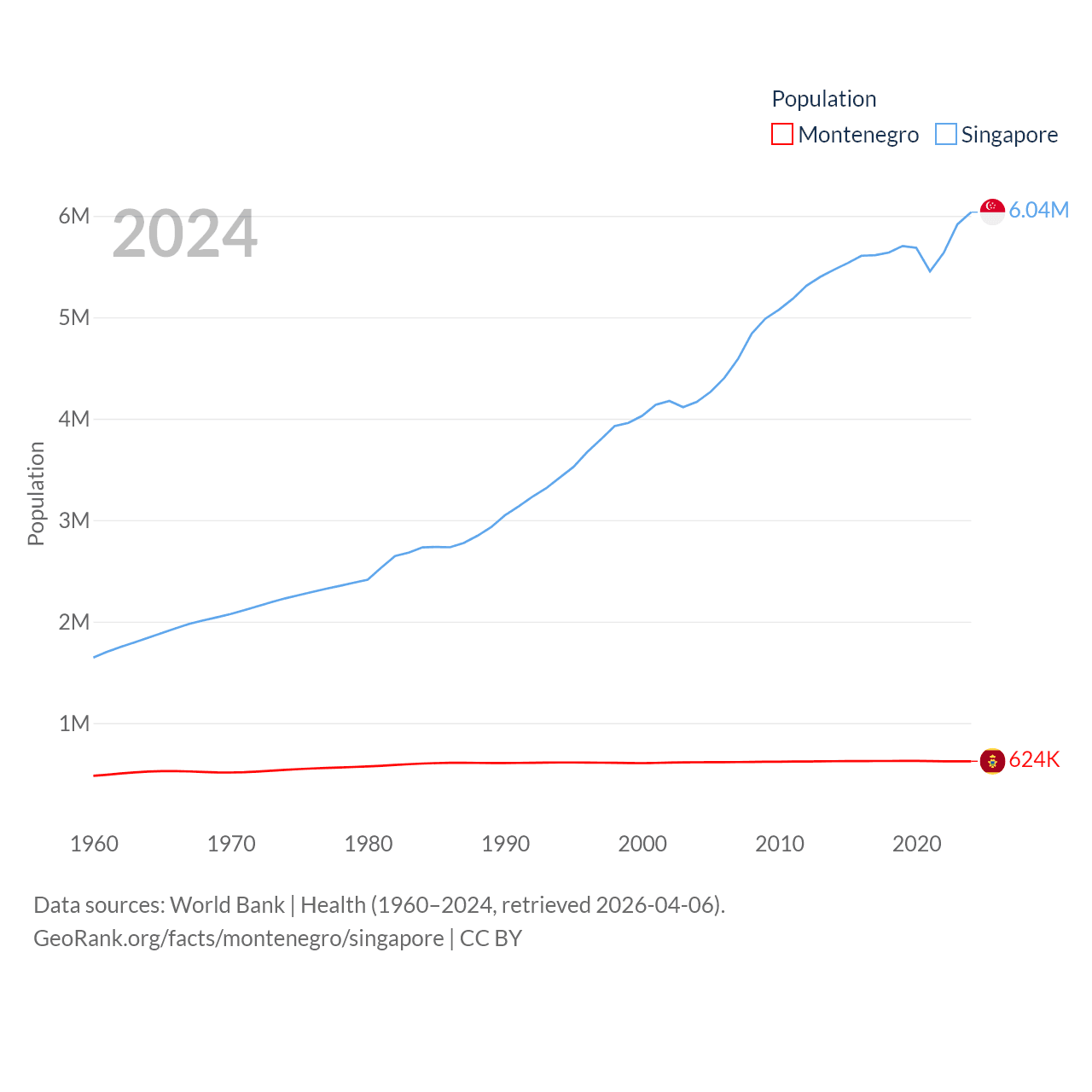 Montenegro has a population of 624K (ranked 166/197), compared with 6.04M in Singapore (ranked 113/197). Montenegro's land area is 5,193 sq mi versus 277.2 sq mi for Singapore (ranked 156th vs. 177th).