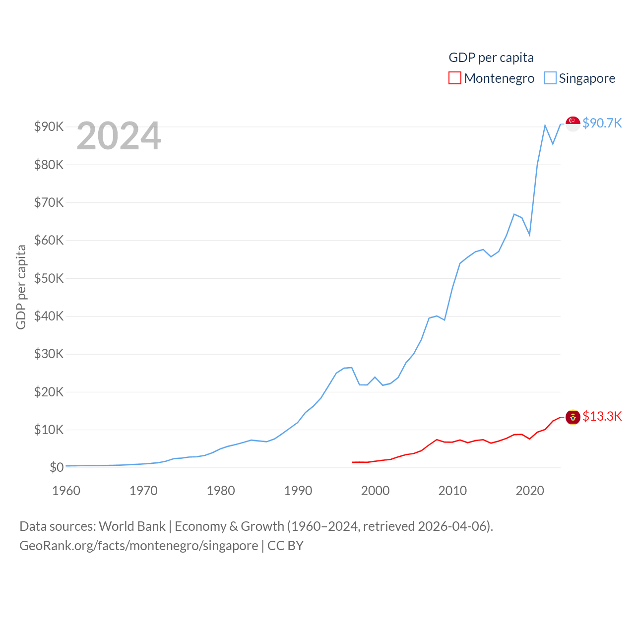 By GDP, Montenegro ranks 155/197 ($8.27B) and Singapore ranks 28/197 ($547B). By GDP per capita, Montenegro ranks 77/197 ($13,263), while Singapore ranks 7/197 ($90,674).