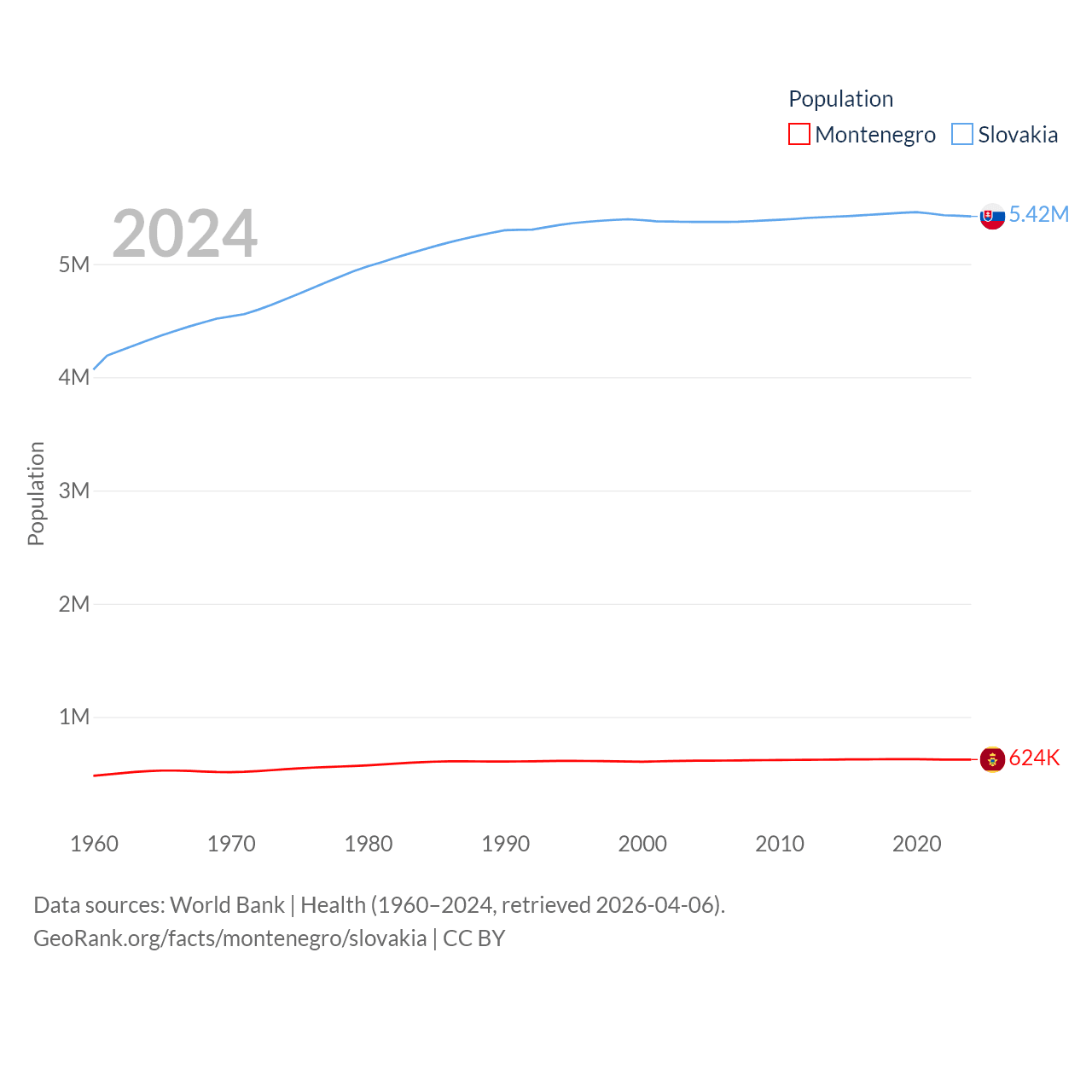 Montenegro has a population of 624K (ranked 166/197), compared with 5.42M in Slovakia (ranked 119/197). Montenegro's land area is 5,193 sq mi versus 18,564 sq mi for Slovakia (ranked 156th vs. 128th).
