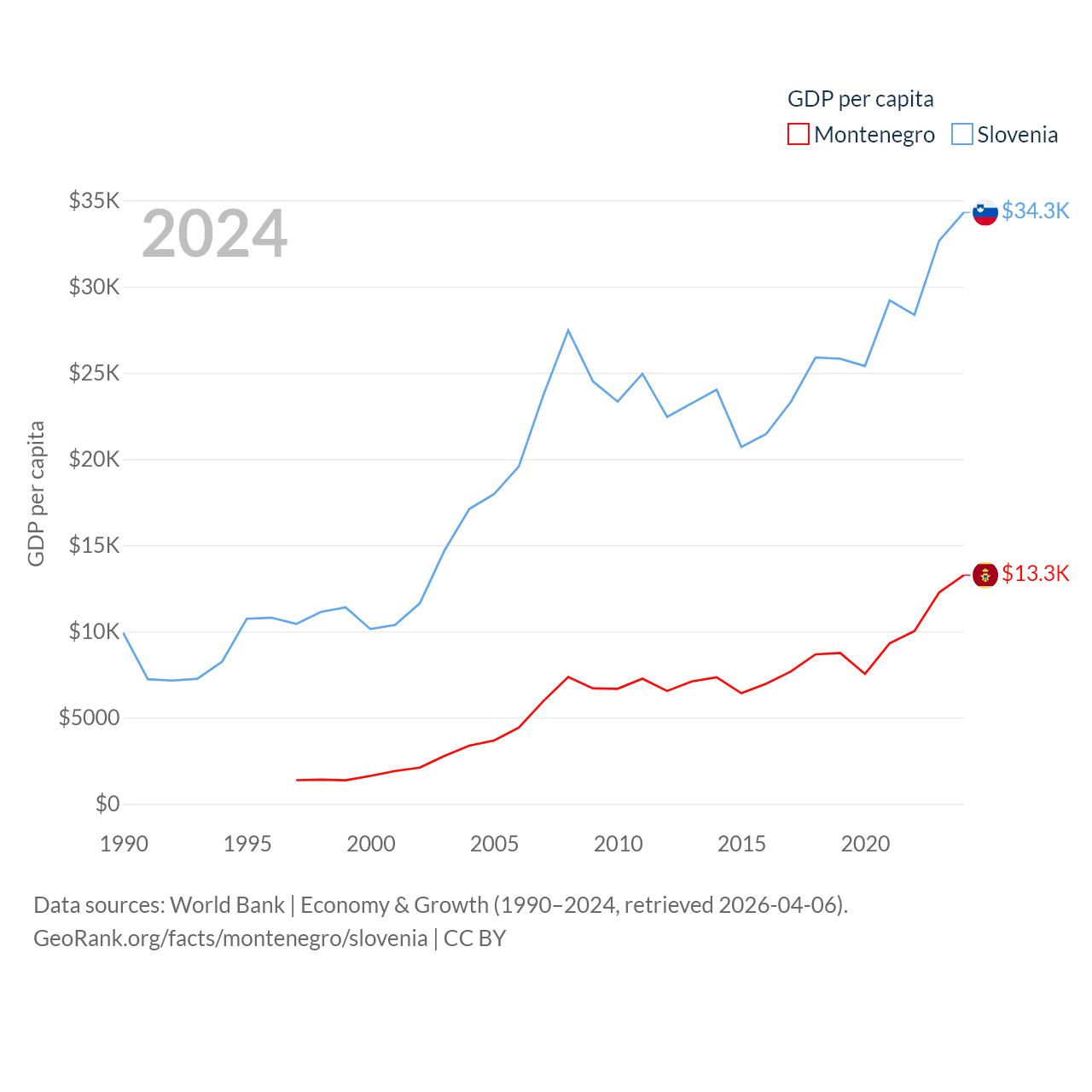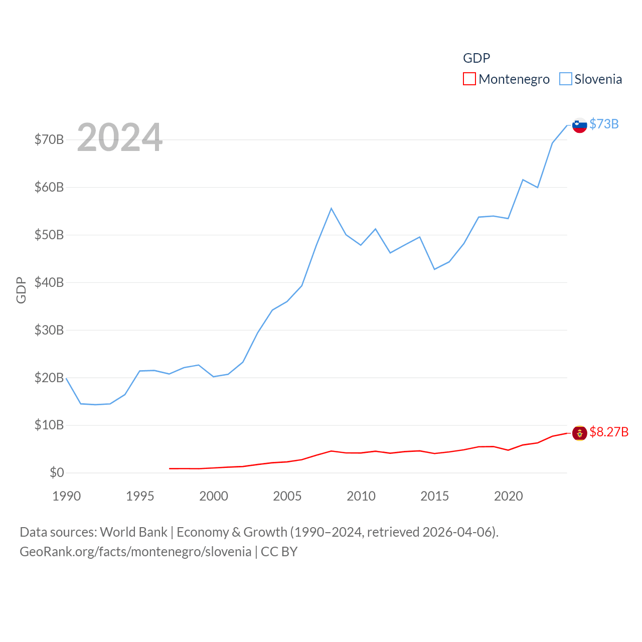 By GDP, Montenegro ranks 155/197 ($8.27B) and Slovenia ranks 86/197 ($73B). By GDP per capita, Montenegro ranks 77/197 ($13,263), while Slovenia ranks 34/197 ($34,301).