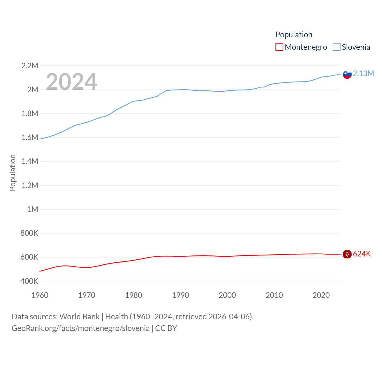 Montenegro has a population of 624K (ranked 166/197), compared with 2.13M in Slovenia (ranked 147/197). Montenegro's land area is 5,193 sq mi versus 7,774 sq mi for Slovenia (ranked 156th vs. 151st).