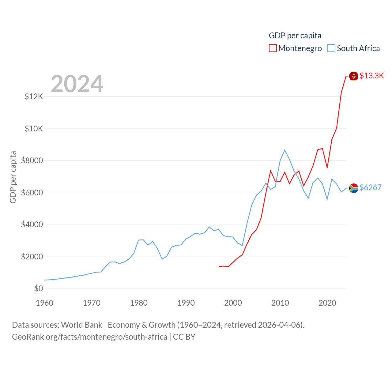 By GDP, Montenegro ranks 155/197 ($8.27B) and South Africa ranks 40/197 ($401B). By GDP per capita, Montenegro ranks 77/197 ($13,263), while South Africa ranks 111/197 ($6,267).
