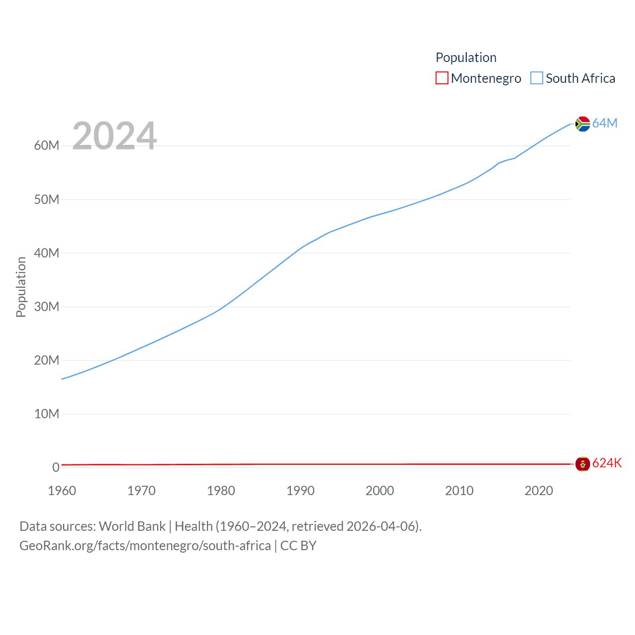 Montenegro has a population of 624K (ranked 166/197), compared with 64M in South Africa (ranked 24/197). Montenegro's land area is 5,193 sq mi versus 468,377 sq mi for South Africa (ranked 156th vs. 24th).