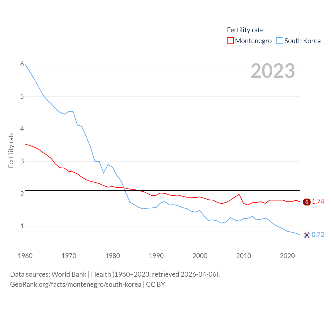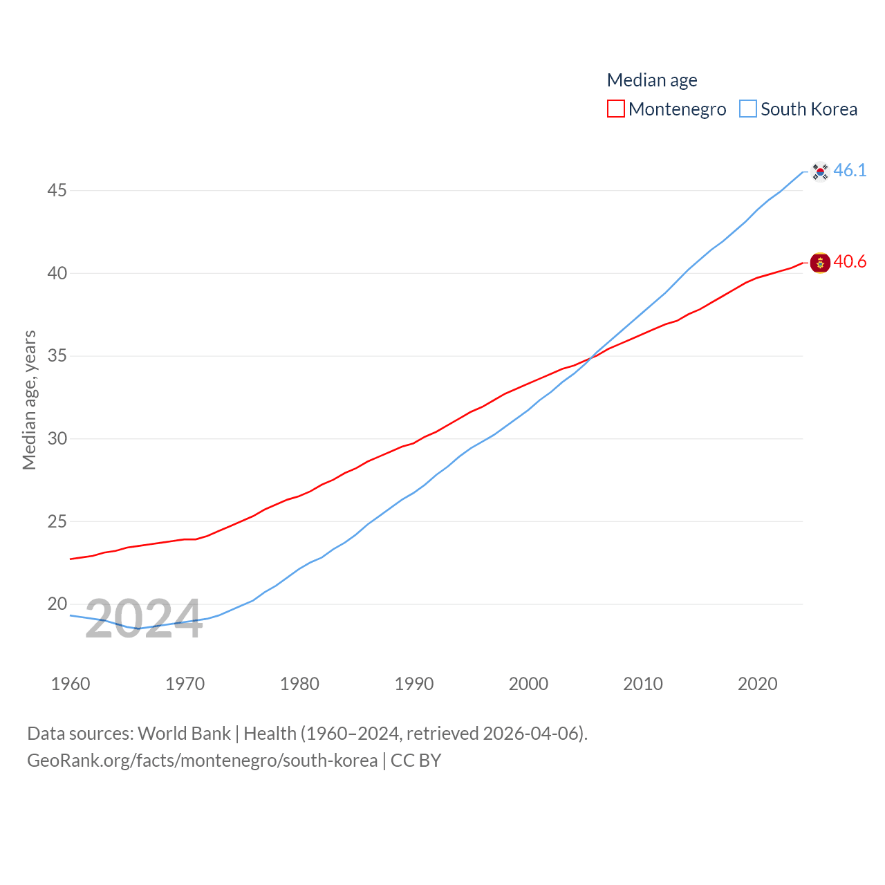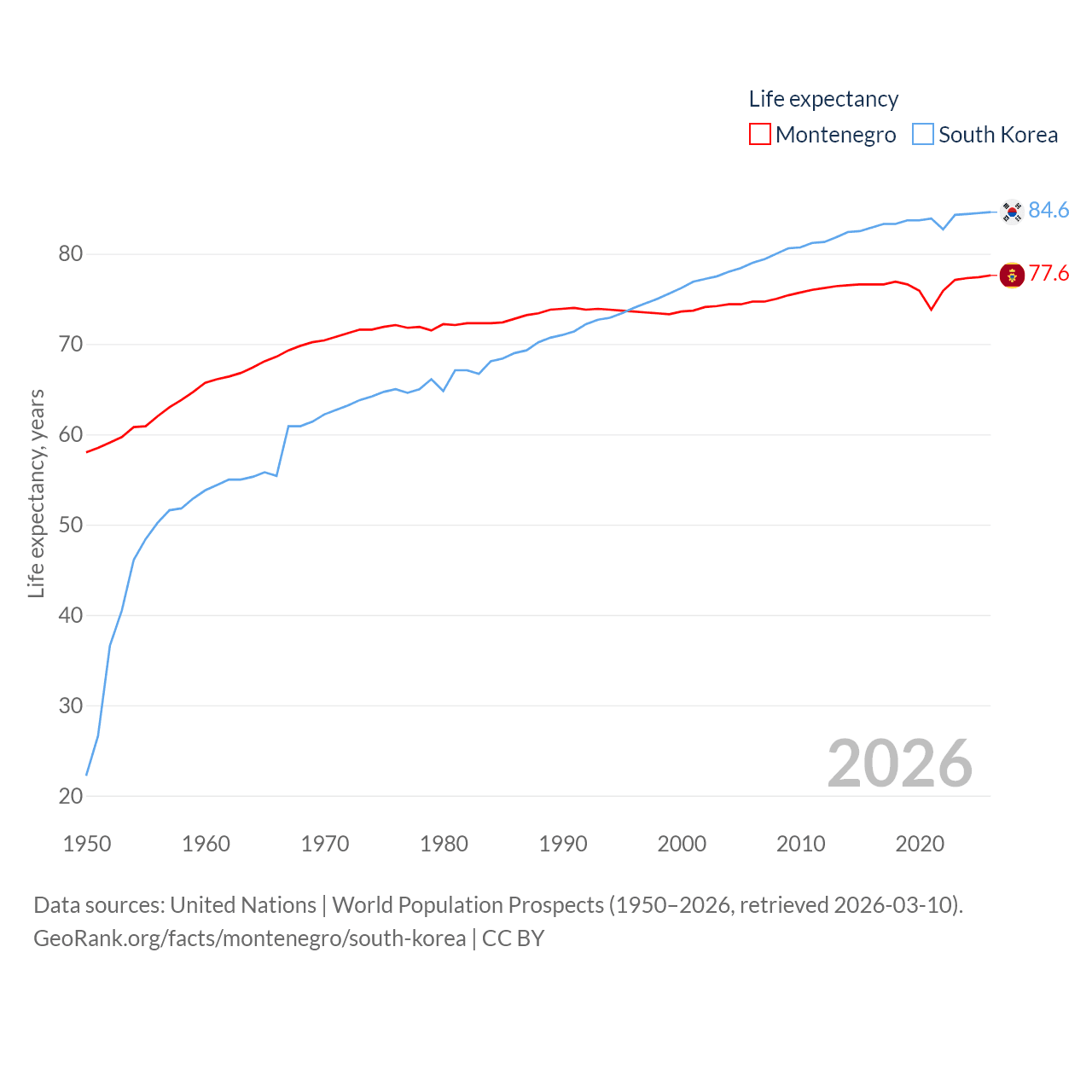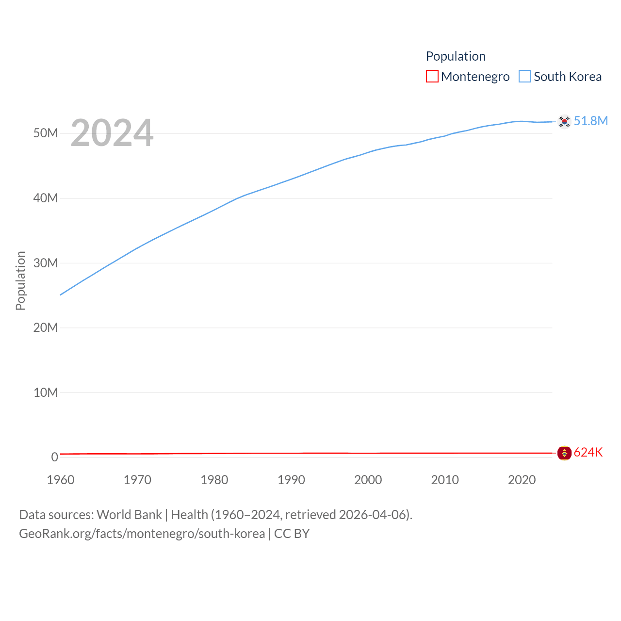 Montenegro has a population of 624K (ranked 166/197), compared with 51.8M in South Korea (ranked 29/197). Montenegro's land area is 5,193 sq mi versus 37,684 sq mi for South Korea (ranked 156th vs. 105th).