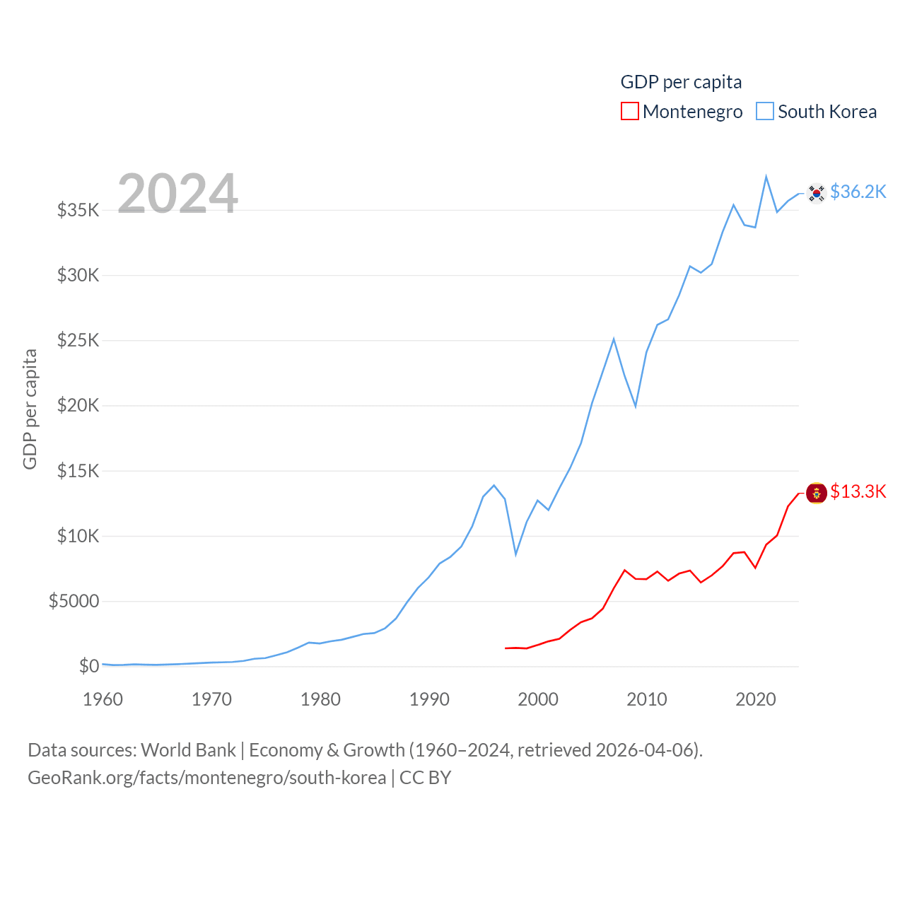 By GDP, Montenegro ranks 155/197 ($8.27B) and South Korea ranks 12/197 ($1.88T). By GDP per capita, Montenegro ranks 77/197 ($13,263), while South Korea ranks 31/197 ($36,239).