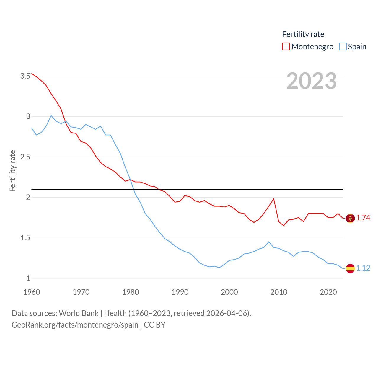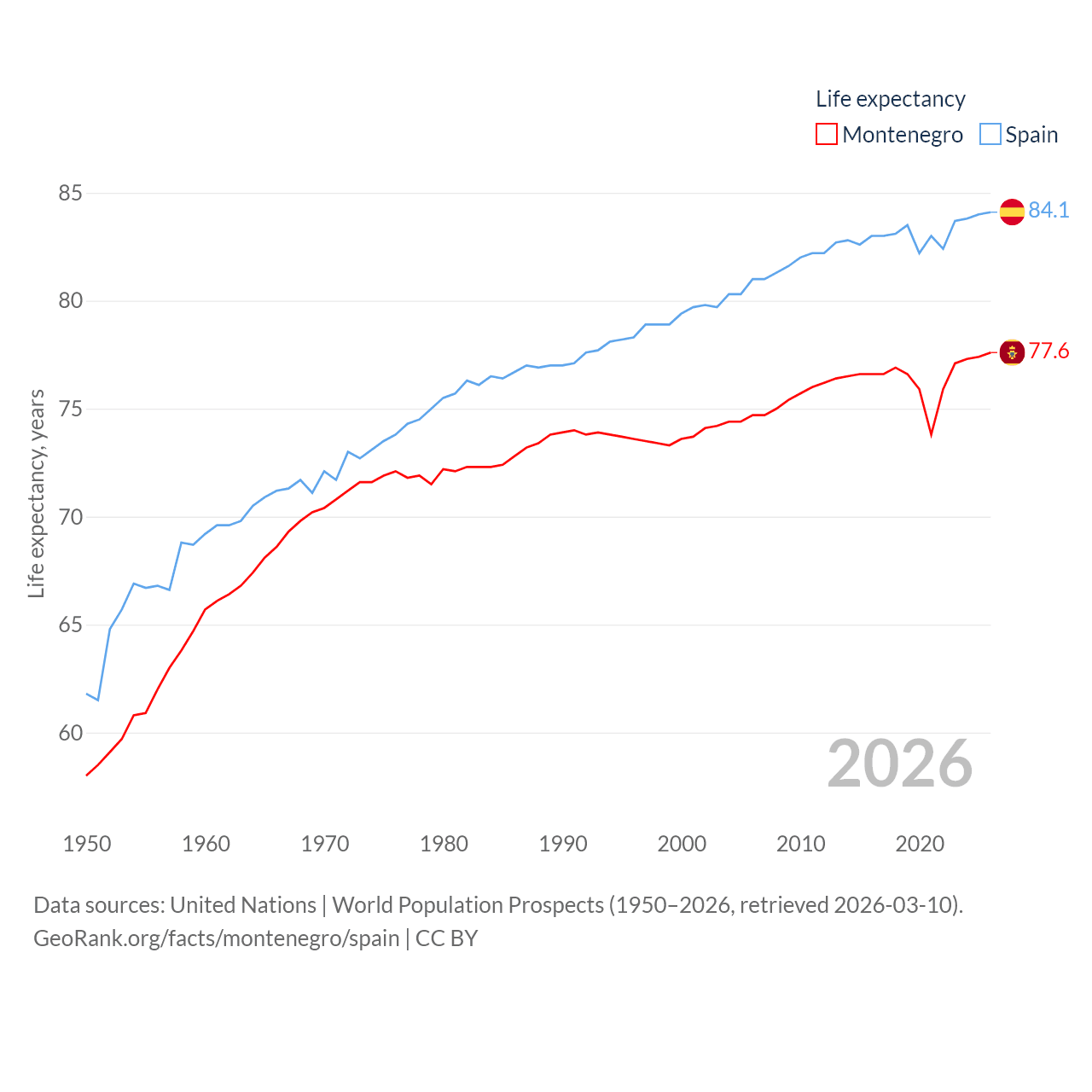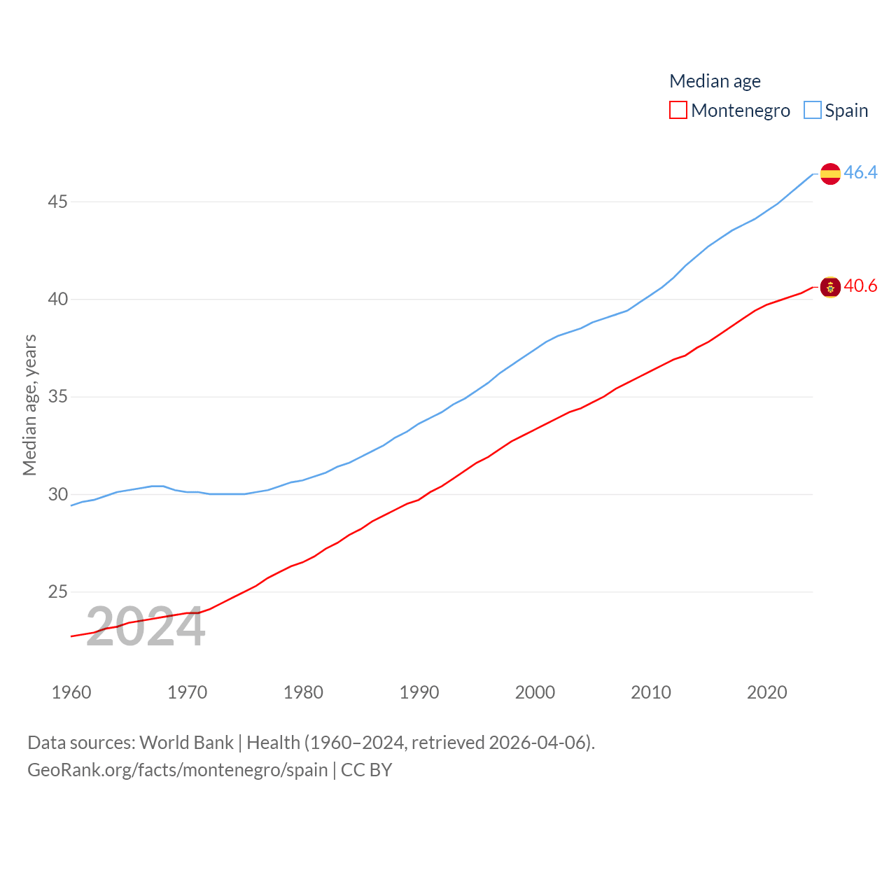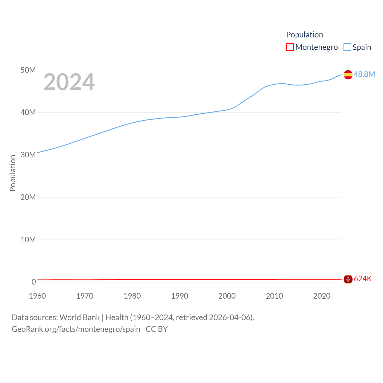 Montenegro has a population of 624K (ranked 166/197), compared with 48.8M in Spain (ranked 32/197). Montenegro's land area is 5,193 sq mi versus 192,934 sq mi for Spain (ranked 156th vs. 51st).