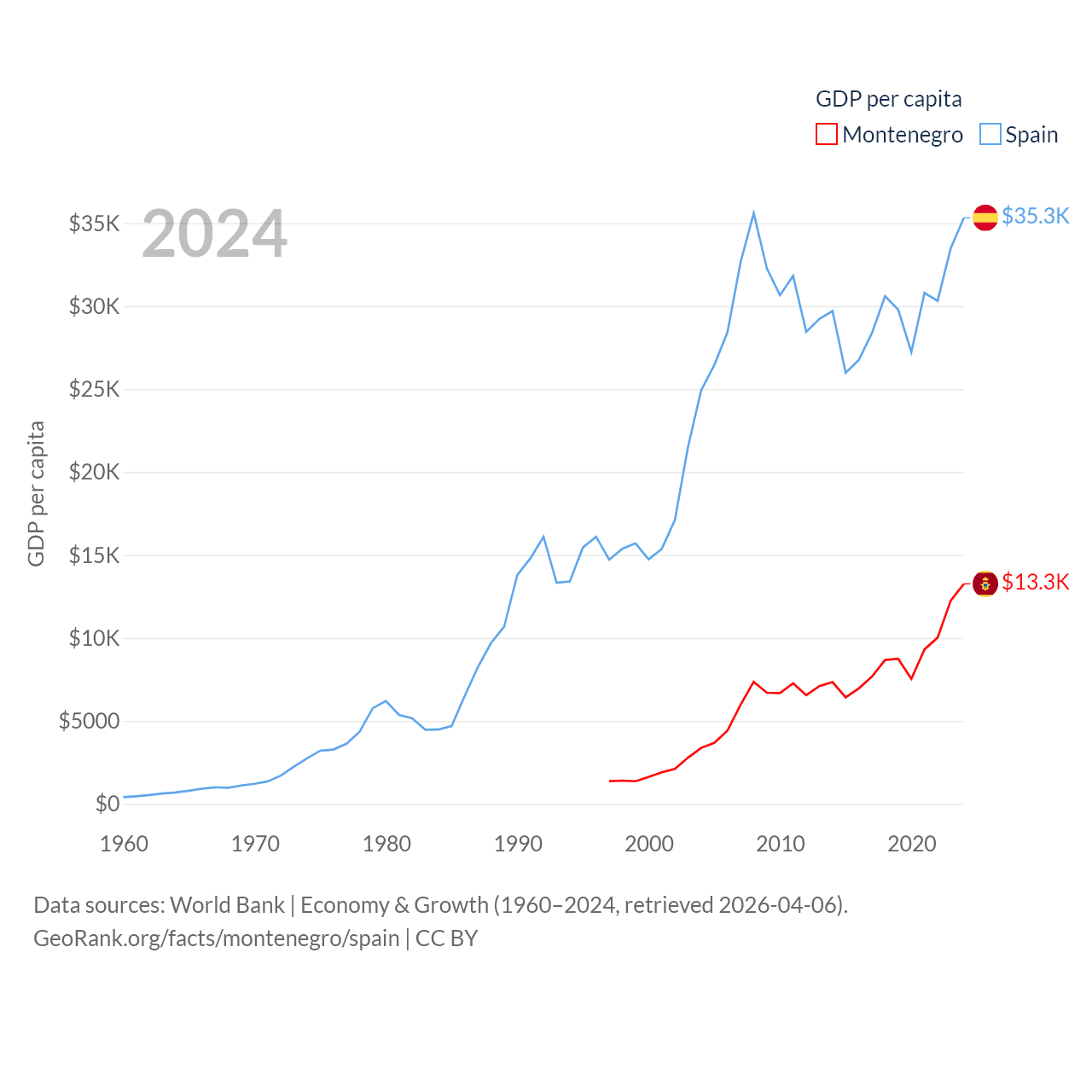 By GDP, Montenegro ranks 155/197 ($8.27B) and Spain ranks 15/197 ($1.73T). By GDP per capita, Montenegro ranks 77/197 ($13,263), while Spain ranks 32/197 ($35,327).