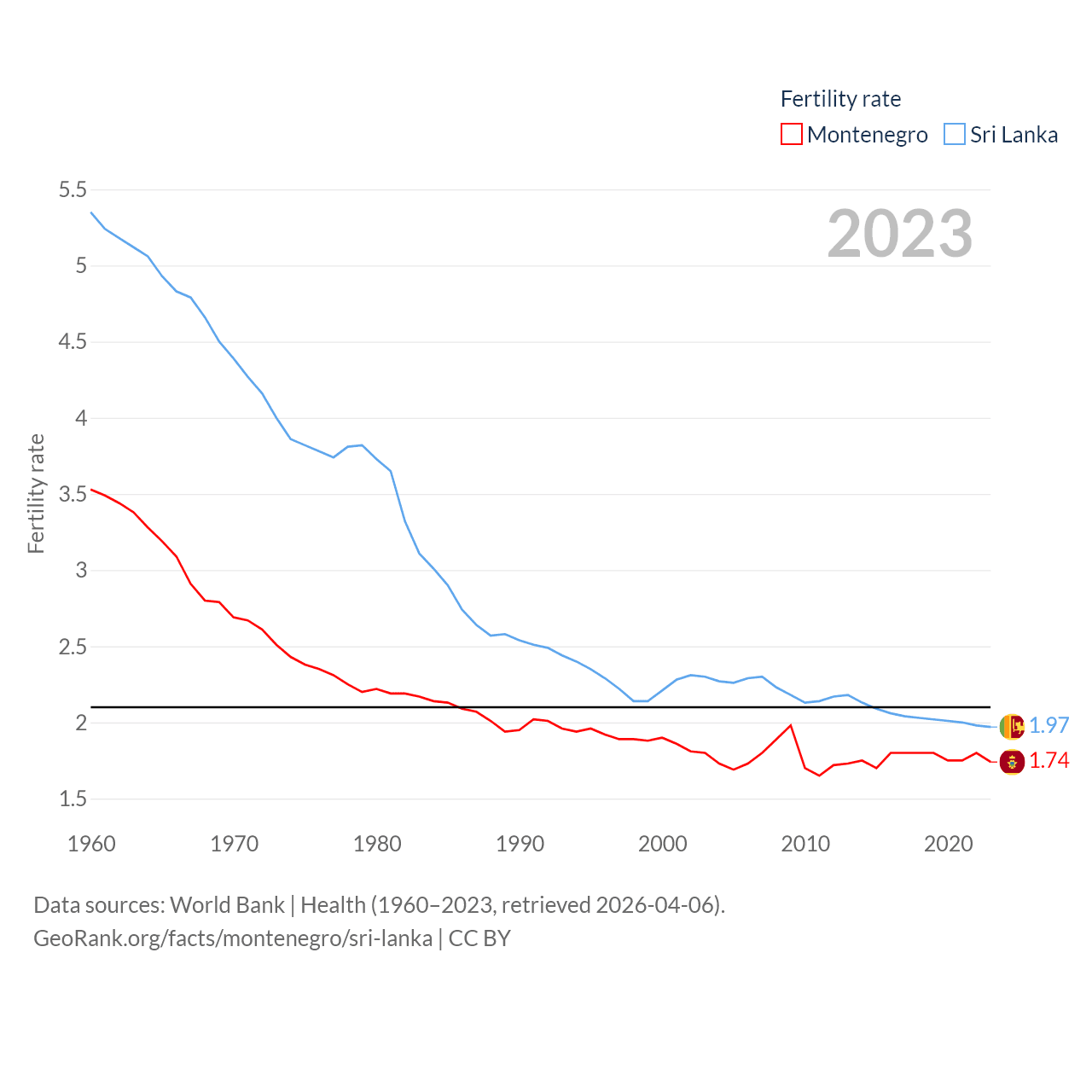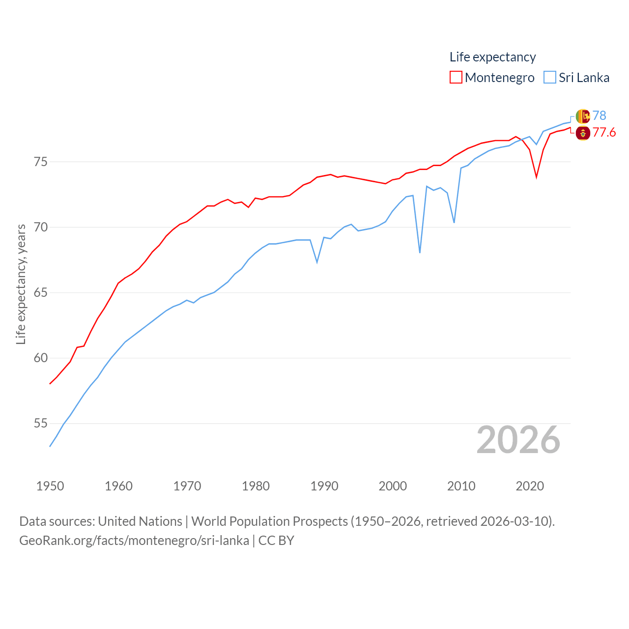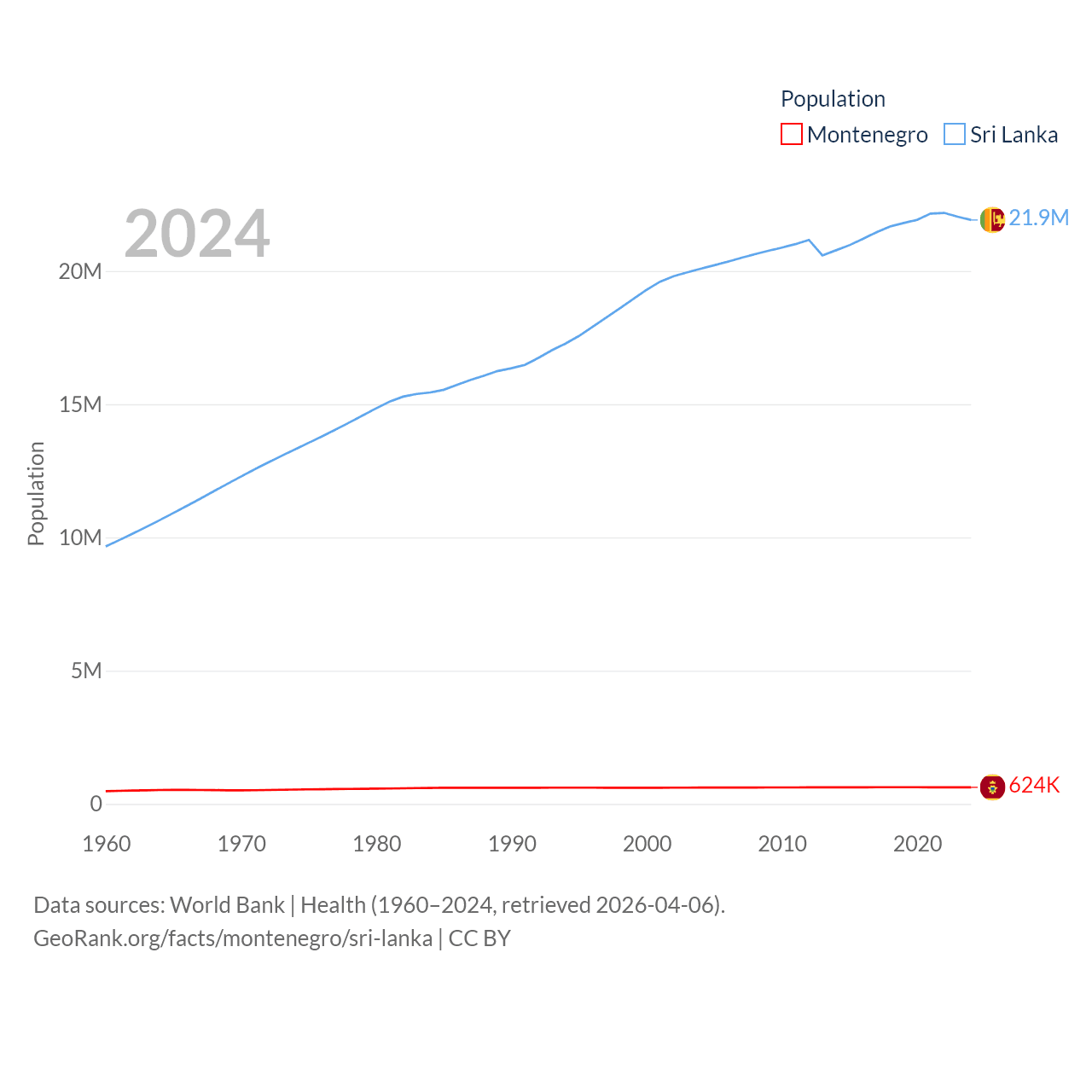 Montenegro has a population of 624K (ranked 166/197), compared with 21.9M in Sri Lanka (ranked 61/197). Montenegro's land area is 5,193 sq mi versus 23,884 sq mi for Sri Lanka (ranked 156th vs. 122nd).