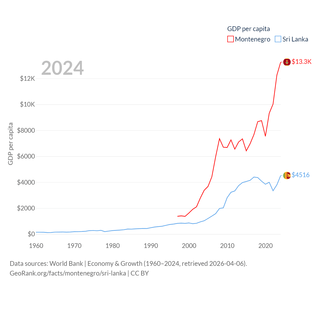 By GDP, Montenegro ranks 155/197 ($8.27B) and Sri Lanka ranks 72/197 ($99B). By GDP per capita, Montenegro ranks 77/197 ($13,263), while Sri Lanka ranks 124/197 ($4,516).