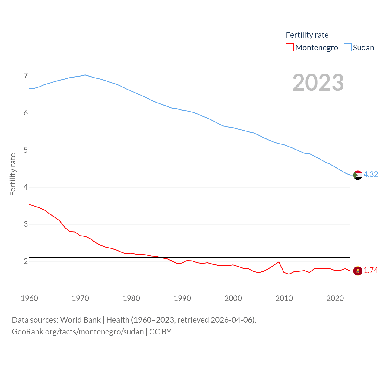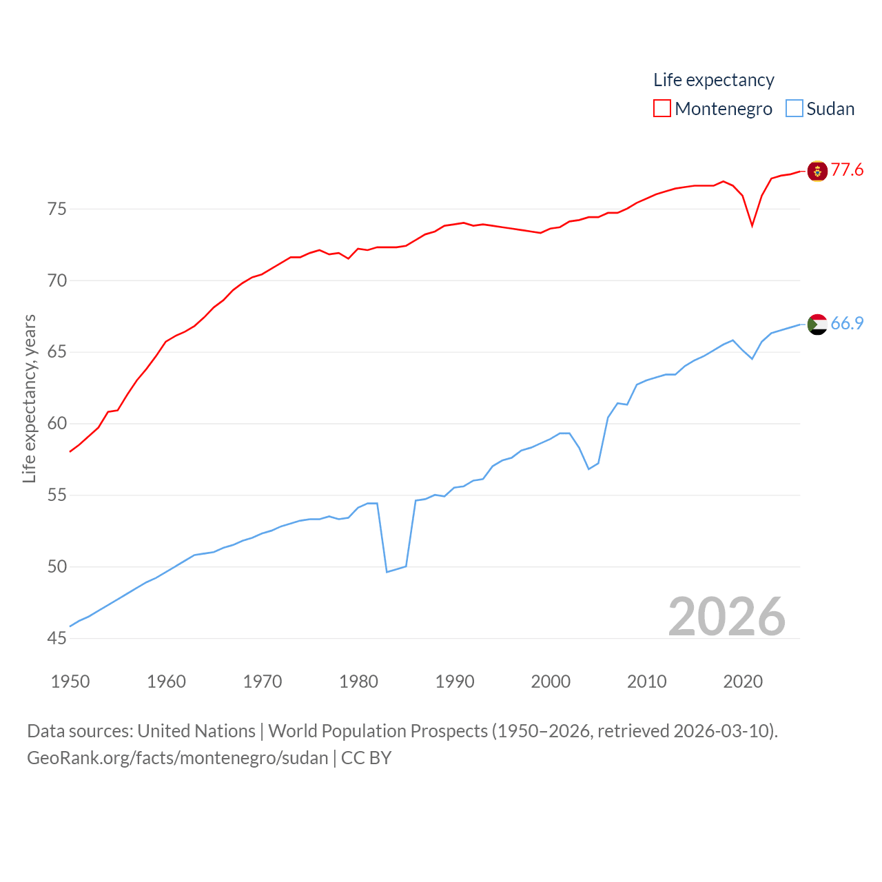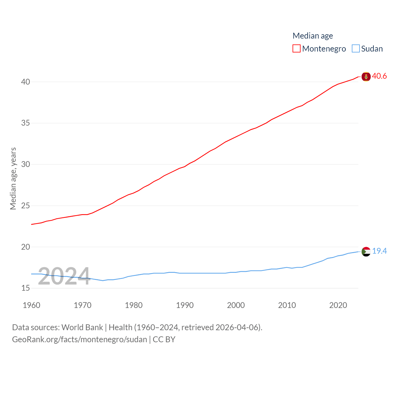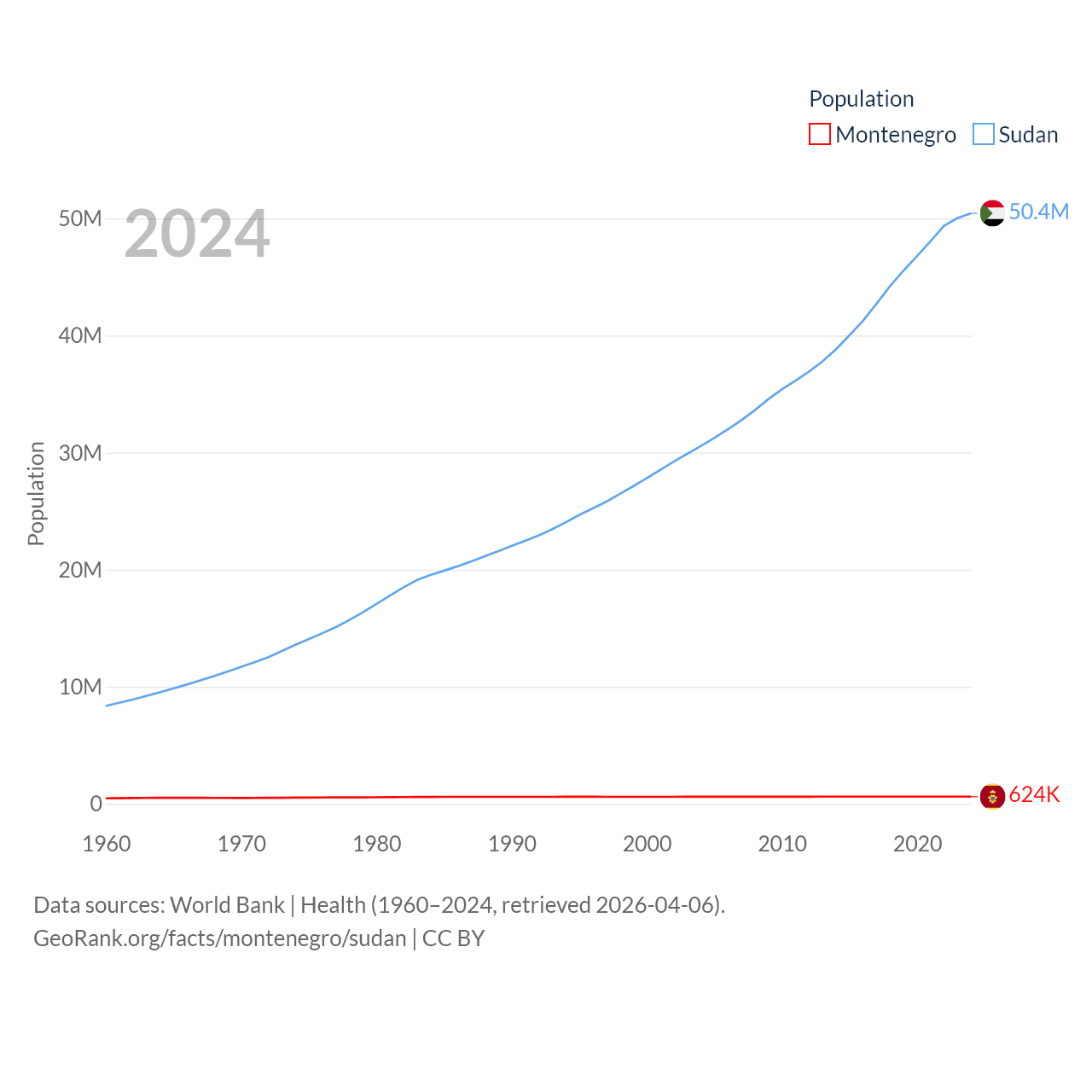 Montenegro has a population of 624K (ranked 166/197), compared with 50.4M in Sudan (ranked 30/197). Montenegro's land area is 5,193 sq mi versus 721,239 sq mi for Sudan (ranked 156th vs. 15th).