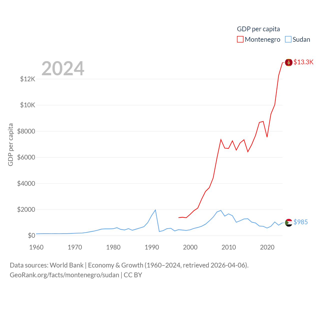 By GDP, Montenegro ranks 155/197 ($8.27B) and Sudan ranks 94/197 ($49.7B). By GDP per capita, Montenegro ranks 77/197 ($13,263), while Sudan ranks 179/197 ($985).