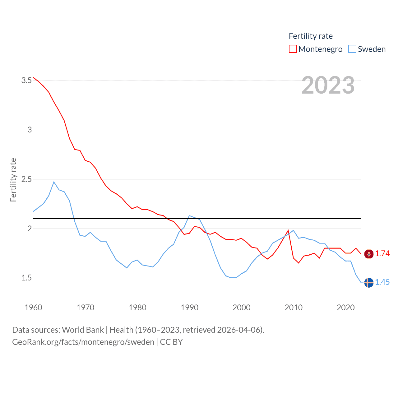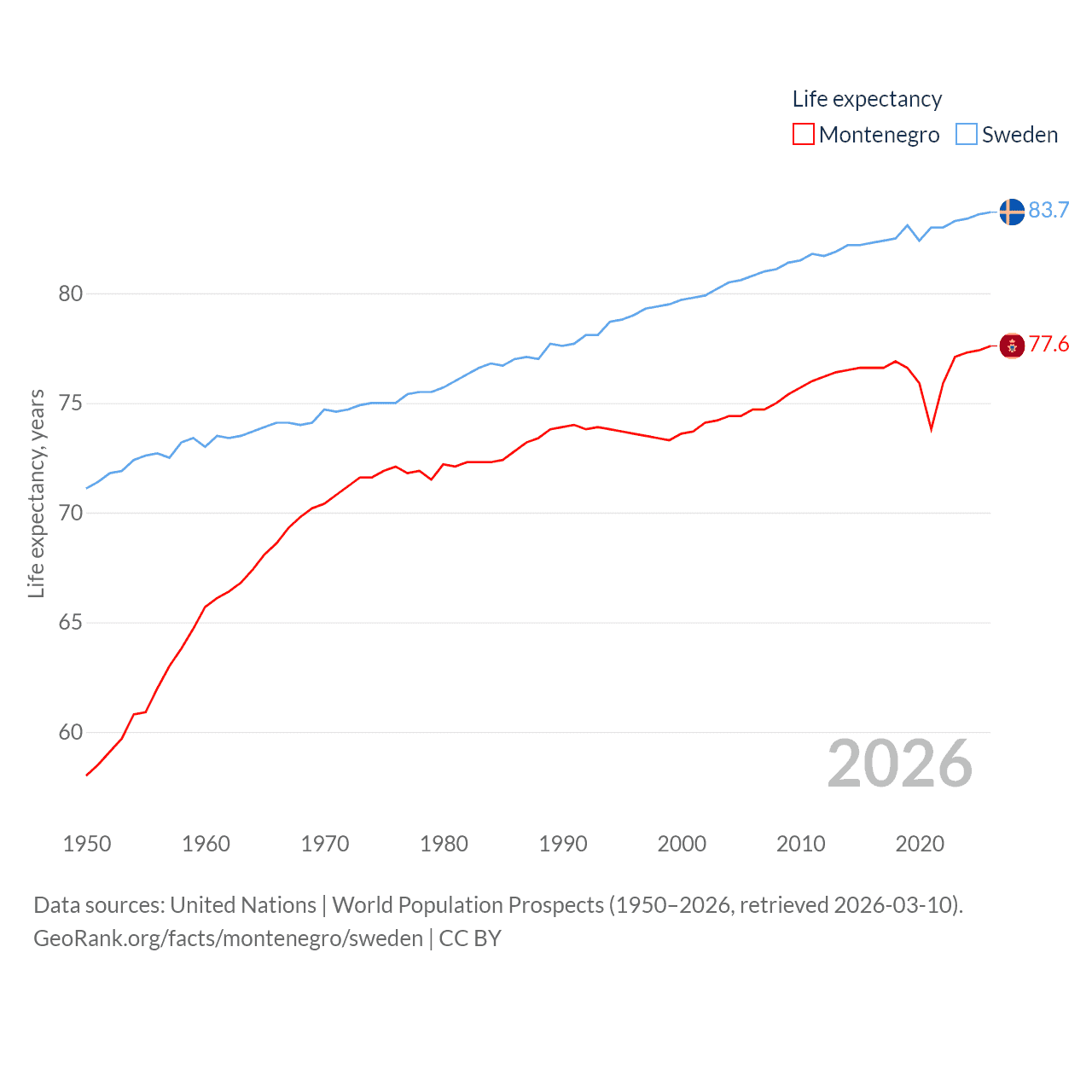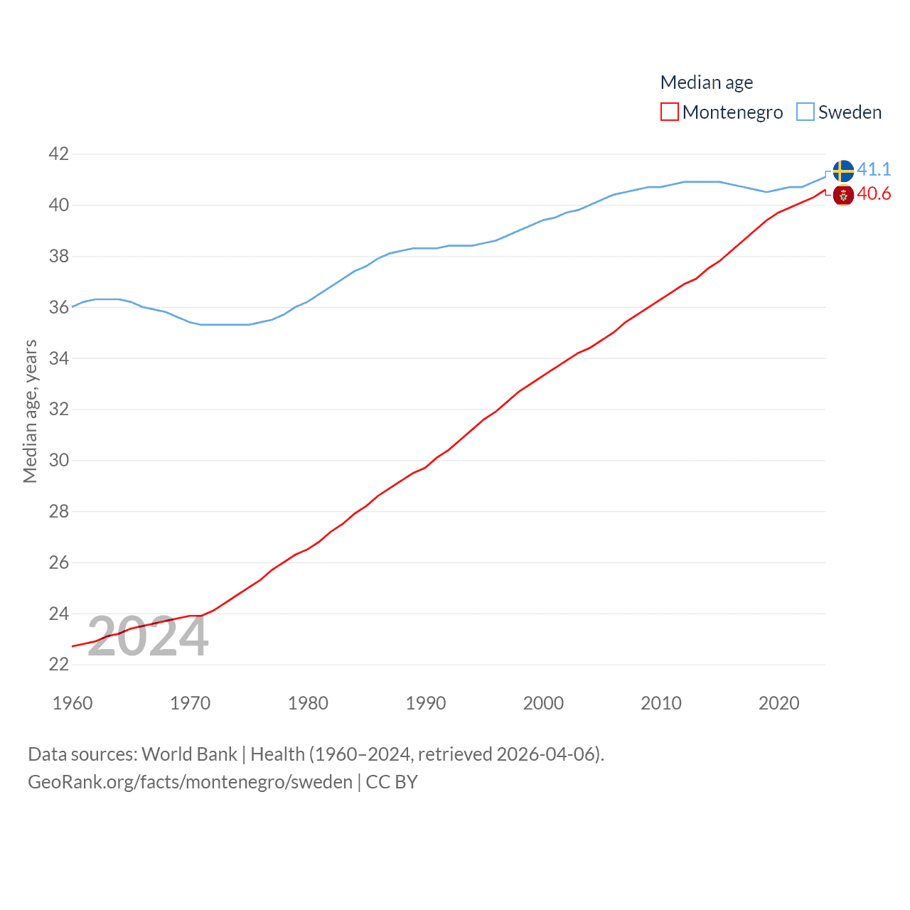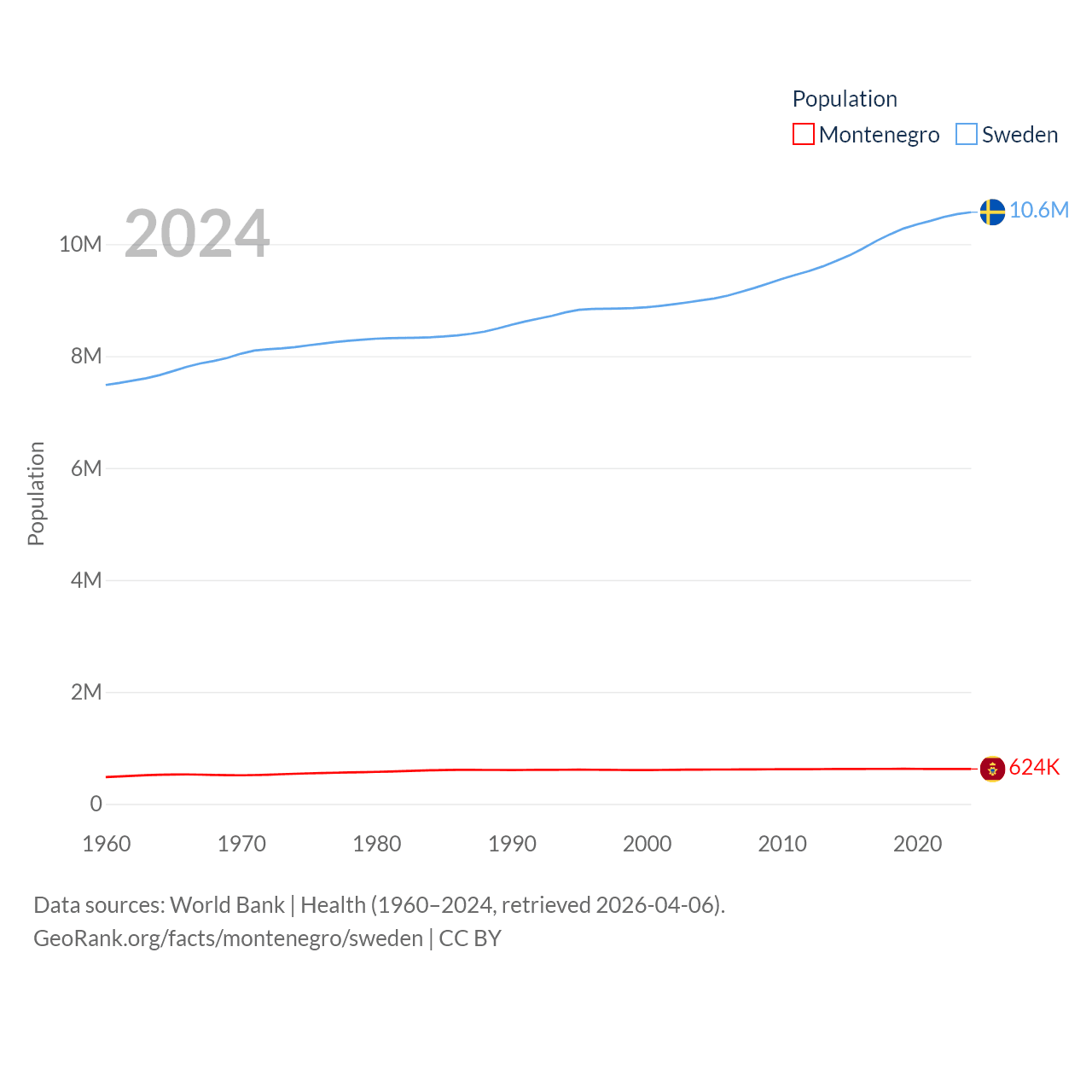 Montenegro has a population of 624K (ranked 166/197), compared with 10.6M in Sweden (ranked 93/197). Montenegro's land area is 5,193 sq mi versus 157,248 sq mi for Sweden (ranked 156th vs. 58th).