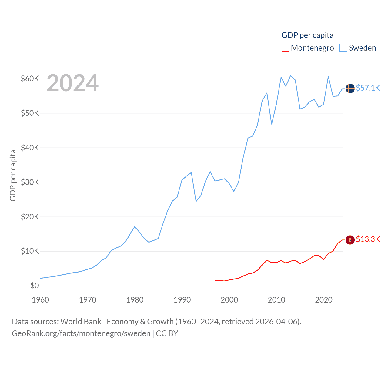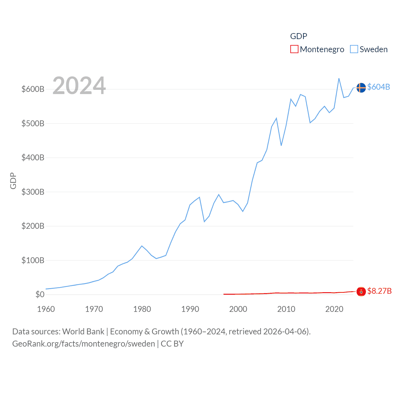 By GDP, Montenegro ranks 155/197 ($8.27B) and Sweden ranks 26/197 ($604B). By GDP per capita, Montenegro ranks 77/197 ($13,263), while Sweden ranks 17/197 ($57,117).