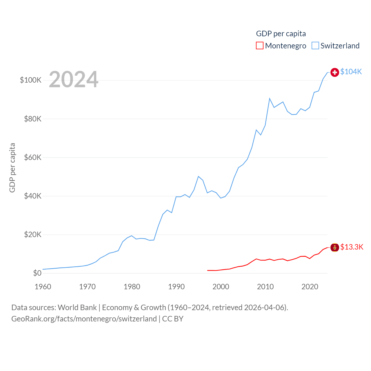By GDP, Montenegro ranks 155/197 ($8.27B) and Switzerland ranks 20/197 ($937B). By GDP per capita, Montenegro ranks 77/197 ($13,263), while Switzerland ranks 5/197 ($103,998).
