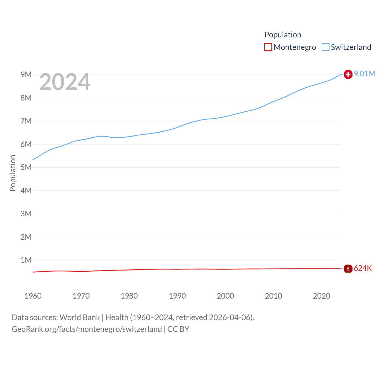 Montenegro has a population of 624K (ranked 166/197), compared with 9.01M in Switzerland (ranked 101/197). Montenegro's land area is 5,193 sq mi versus 15,255 sq mi for Switzerland (ranked 156th vs. 131st).