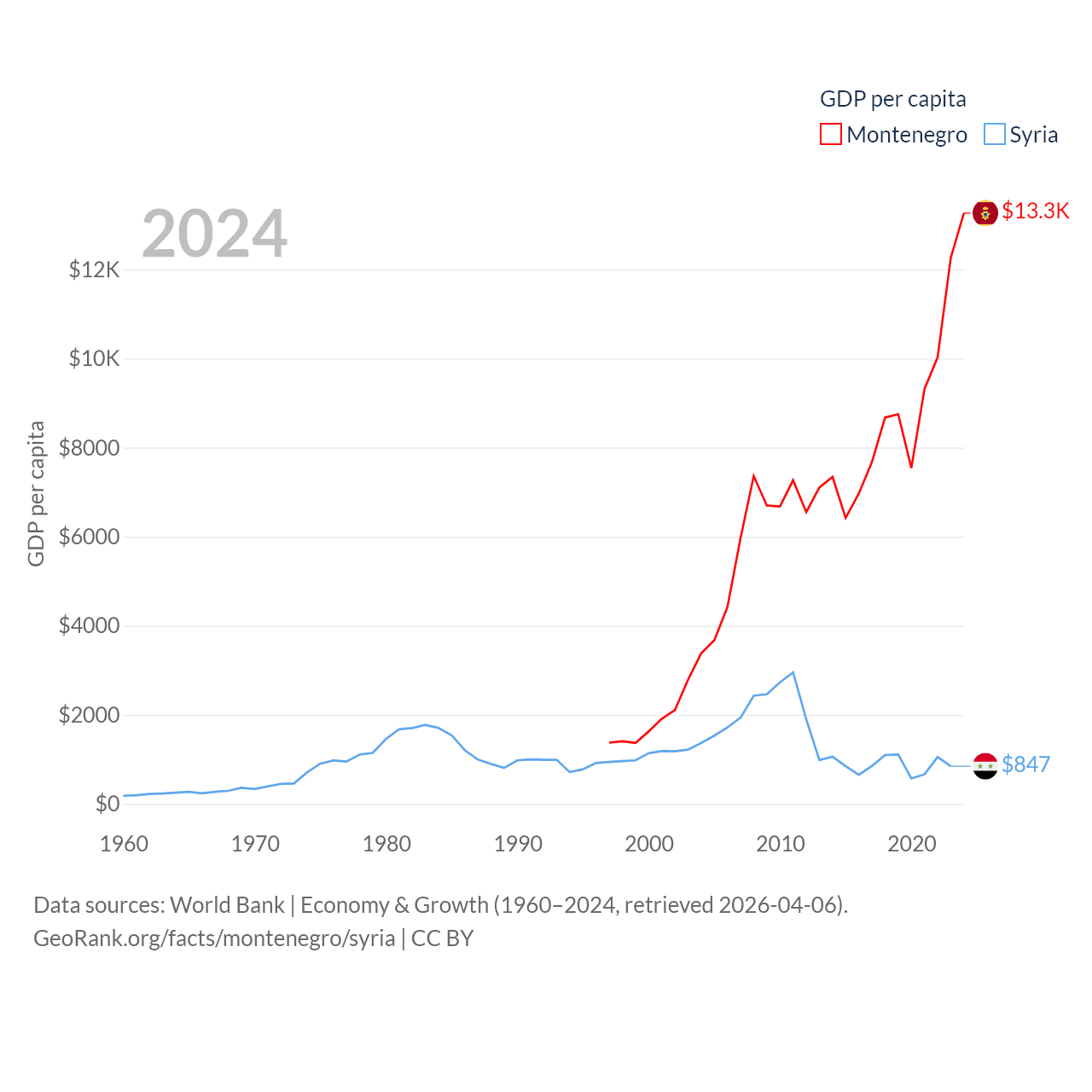 By GDP, Montenegro ranks 155/197 ($8.27B) and Syria ranks 129/197 ($20B). By GDP per capita, Montenegro ranks 77/197 ($13,263), while Syria ranks 185/197 ($847).
