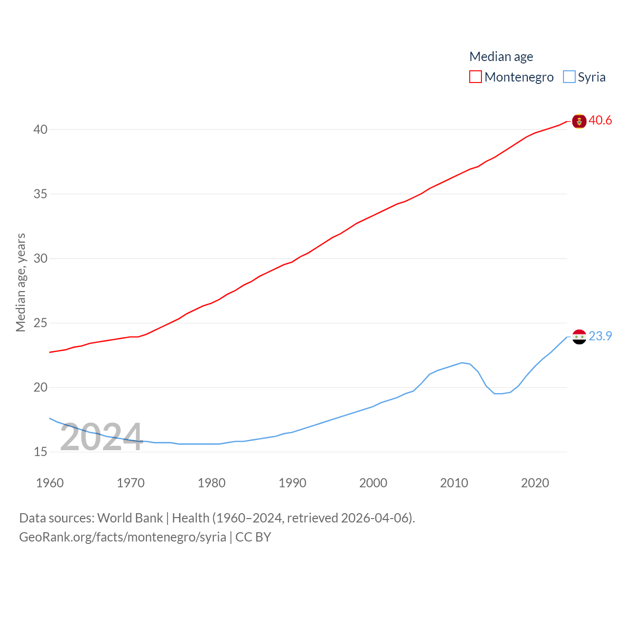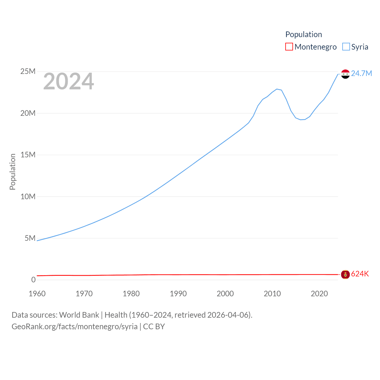 Montenegro has a population of 624K (ranked 166/197), compared with 24.7M in Syria (ranked 57/197). Montenegro's land area is 5,193 sq mi versus 70,900 sq mi for Syria (ranked 156th vs. 87th).