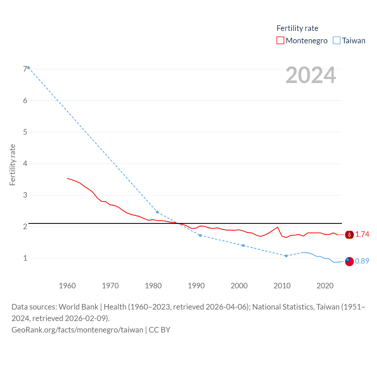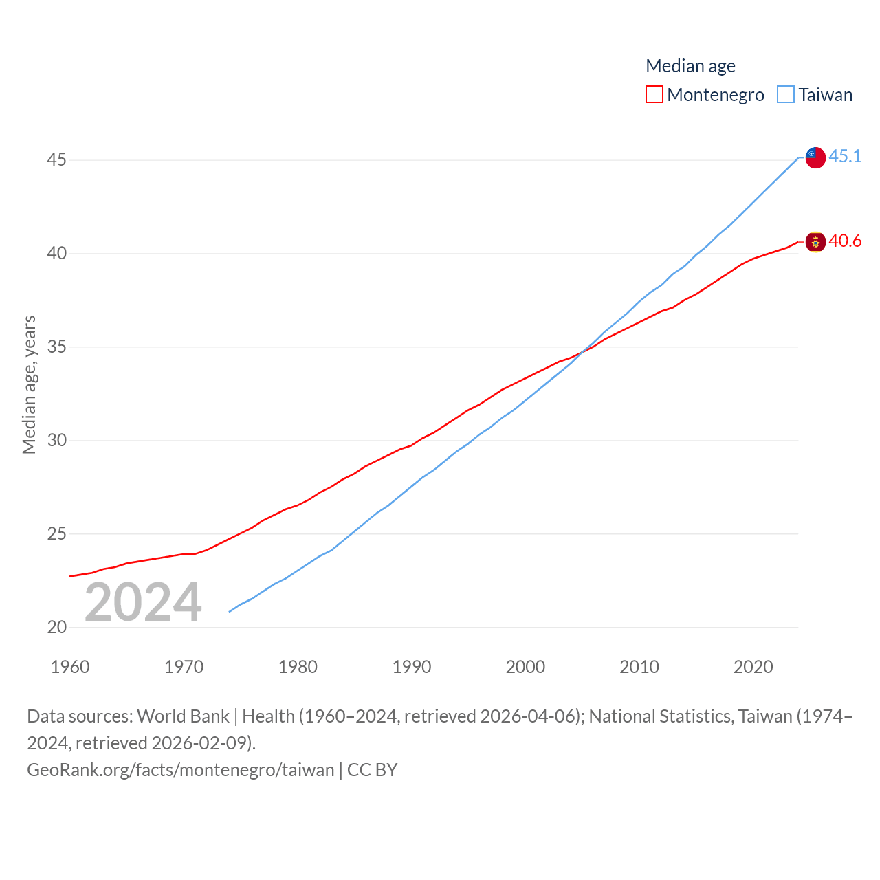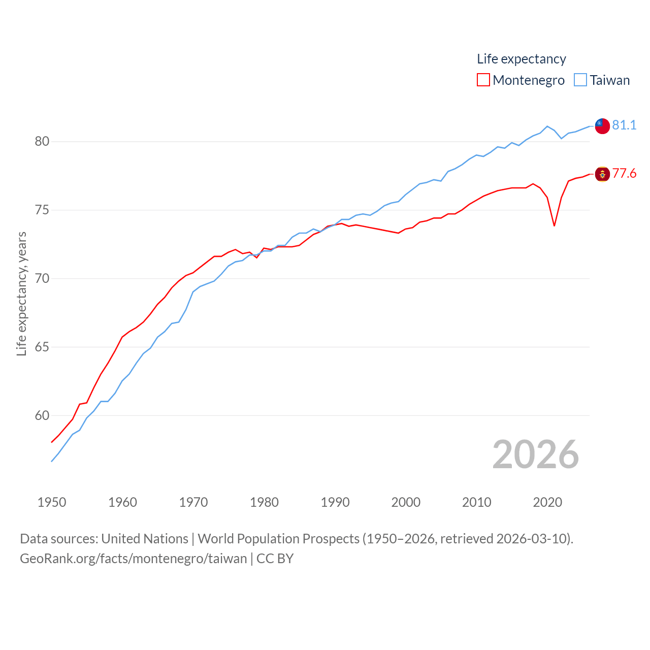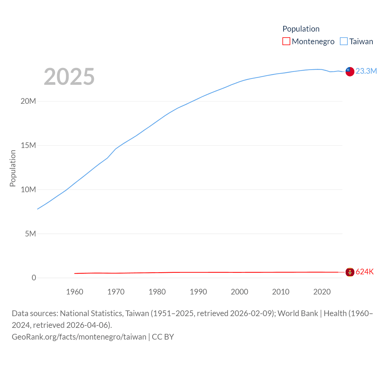 Montenegro has a population of 624K (ranked 166/197), compared with 23.3M in Taiwan (ranked 60/197). Montenegro's land area is 5,193 sq mi versus 13,976 sq mi for Taiwan (ranked 156th vs. 133rd).