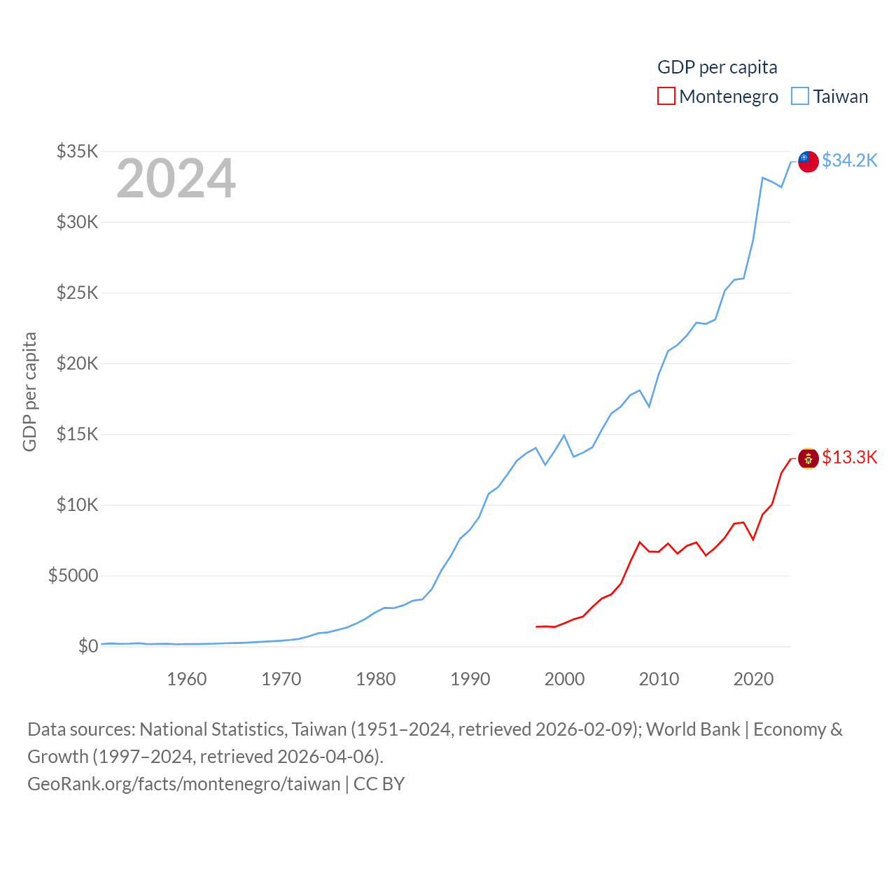 By GDP, Montenegro ranks 155/197 ($8.27B) and Taiwan ranks 22/197 ($802B). By GDP per capita, Montenegro ranks 77/197 ($13,263), while Taiwan ranks 35/197 ($34,238).