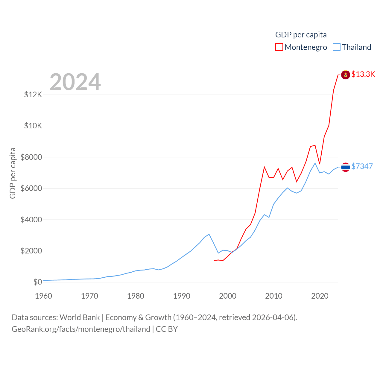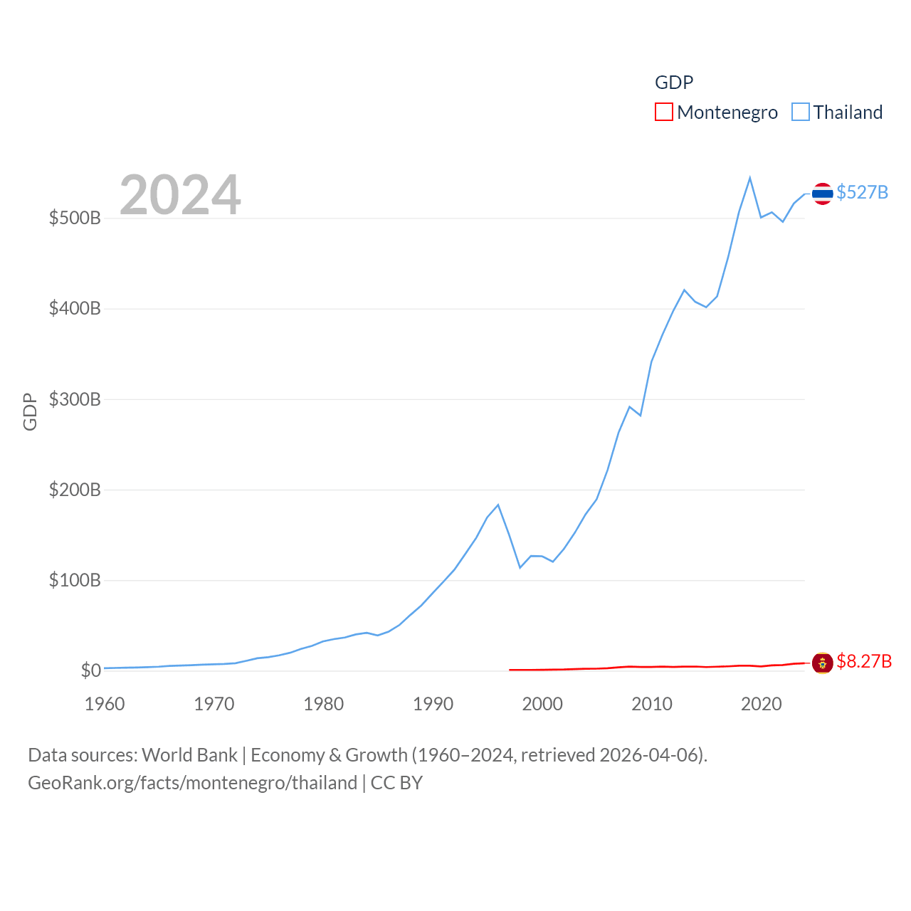 By GDP, Montenegro ranks 155/197 ($8.27B) and Thailand ranks 31/197 ($527B). By GDP per capita, Montenegro ranks 77/197 ($13,263), while Thailand ranks 100/197 ($7,347).
