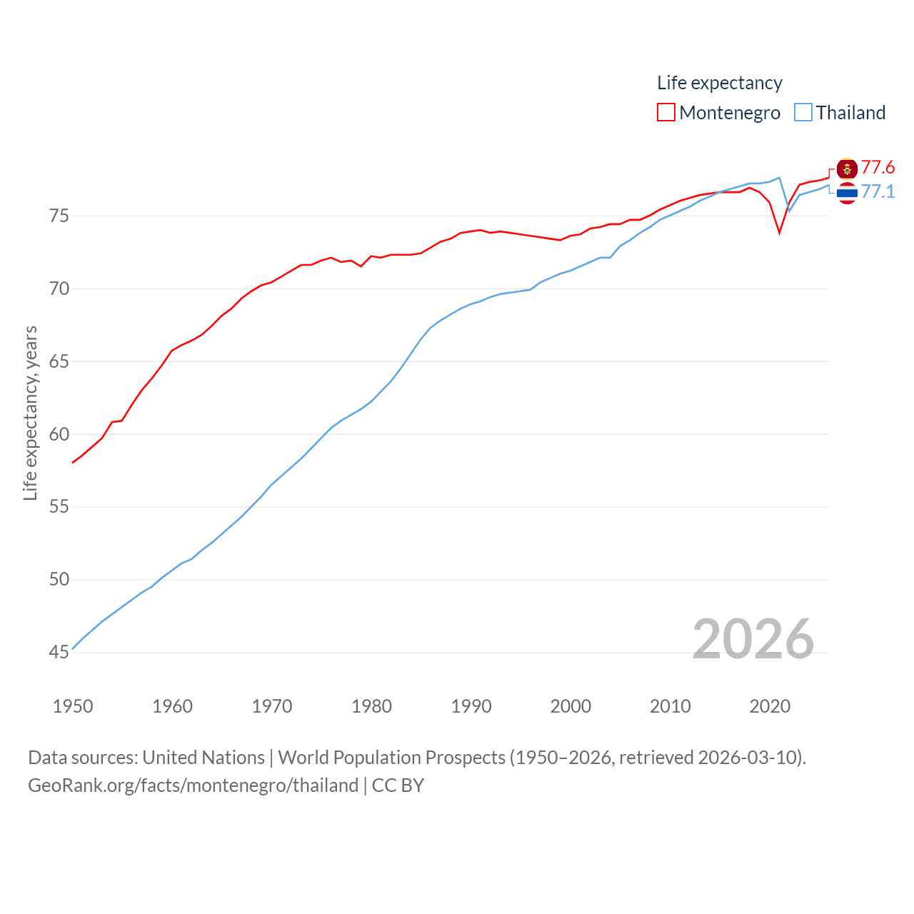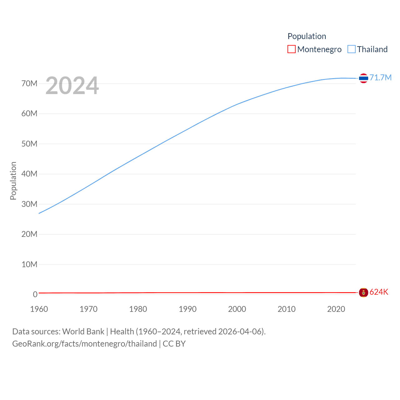Montenegro has a population of 624K (ranked 166/197), compared with 71.7M in Thailand (ranked 20/197). Montenegro's land area is 5,193 sq mi versus 197,256 sq mi for Thailand (ranked 156th vs. 50th).