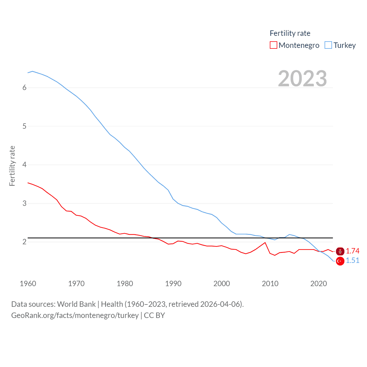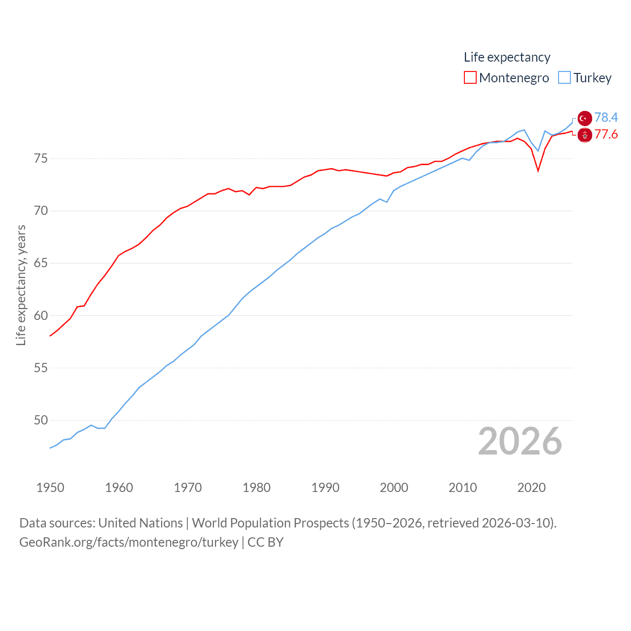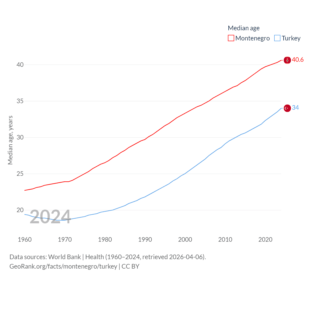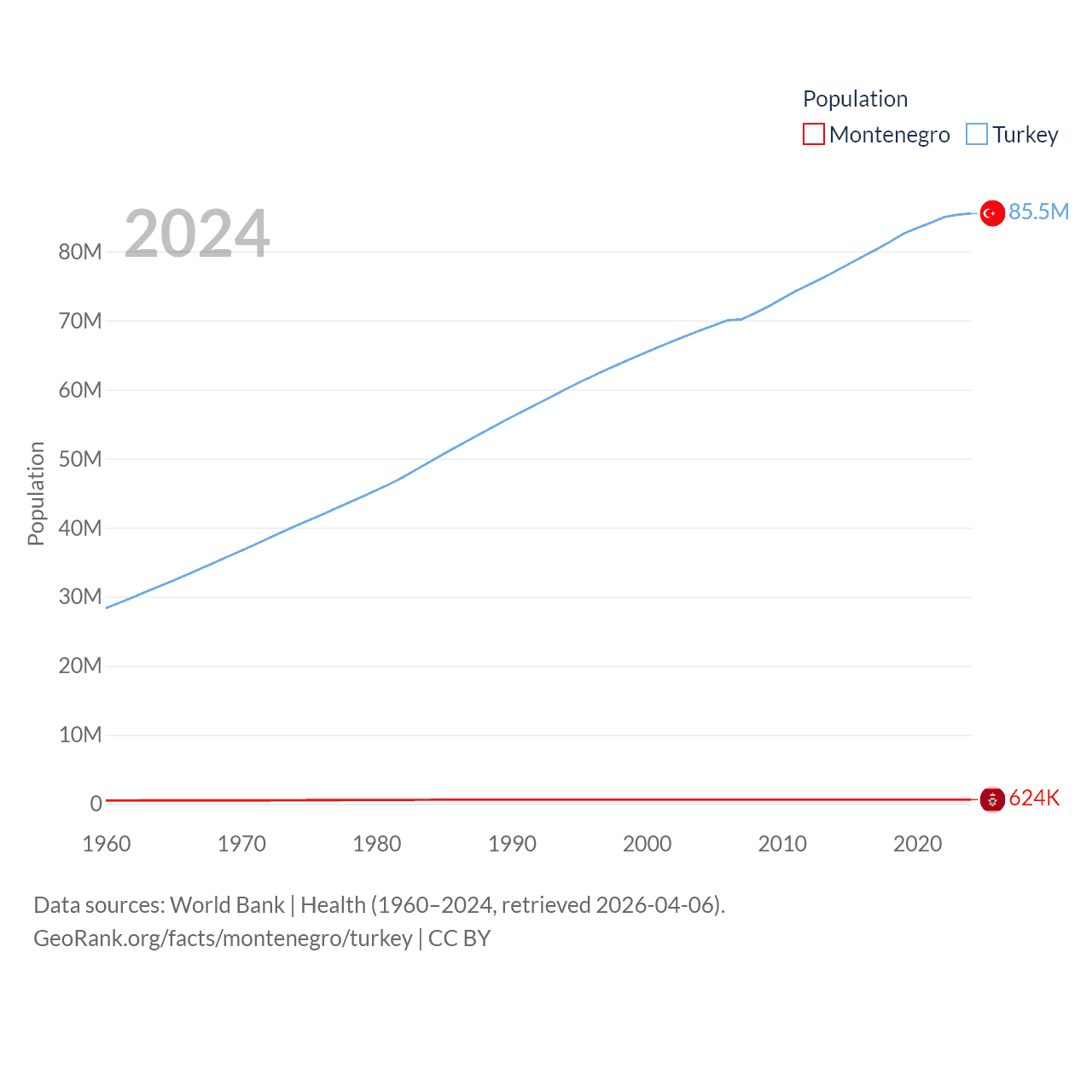 Montenegro has a population of 624K (ranked 166/197), compared with 85.5M in Turkey (ranked 18/197). Montenegro's land area is 5,193 sq mi versus 297,156 sq mi for Turkey (ranked 156th vs. 36th).