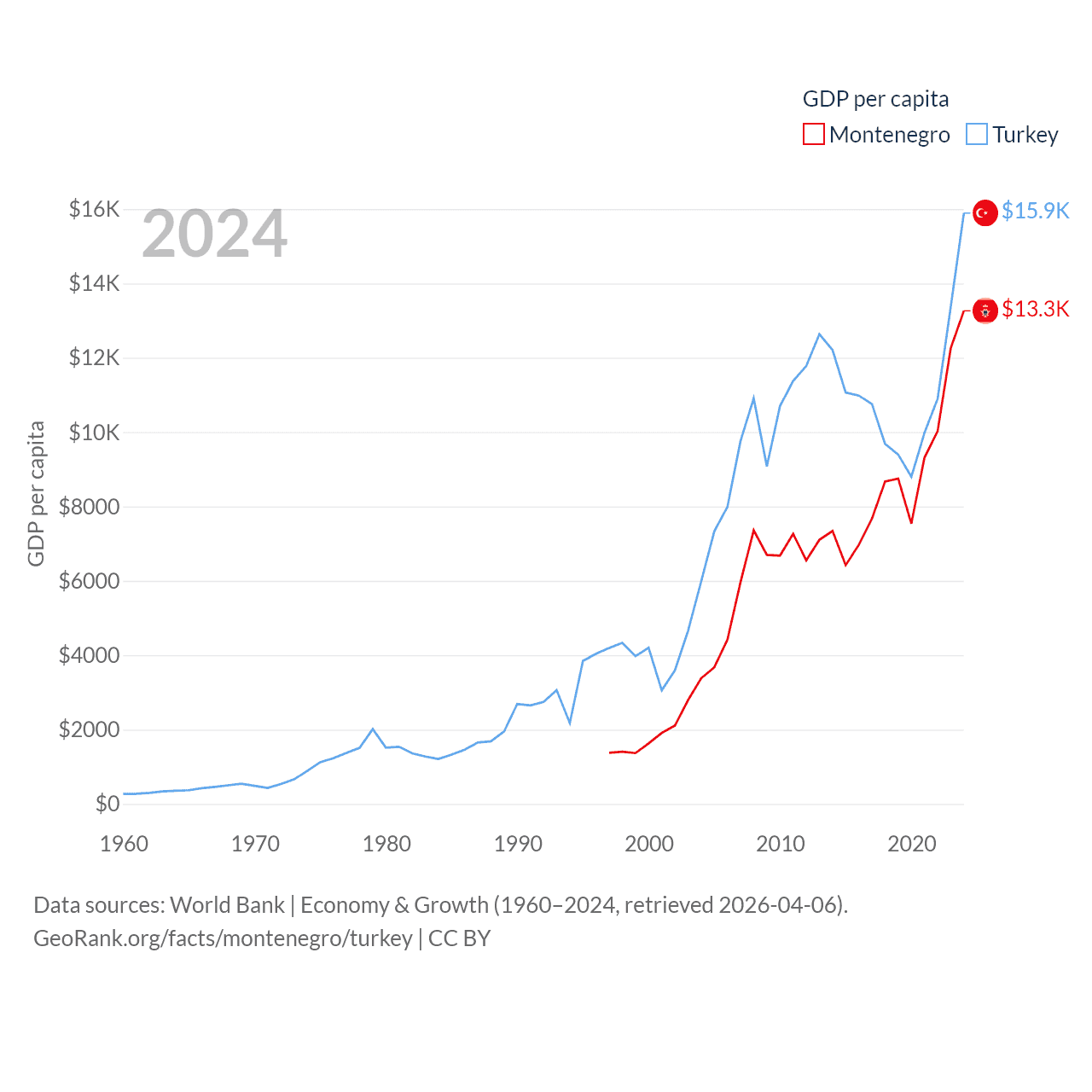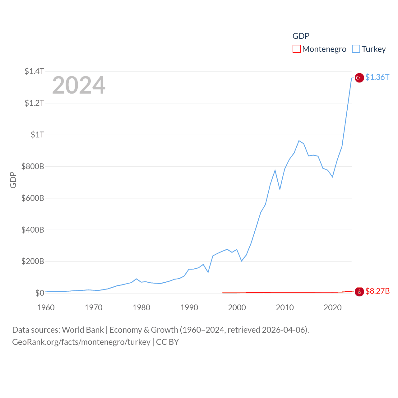 By GDP, Montenegro ranks 155/197 ($8.27B) and Turkey ranks 17/197 ($1.36T). By GDP per capita, Montenegro ranks 77/197 ($13,263), while Turkey ranks 66/197 ($15,893).